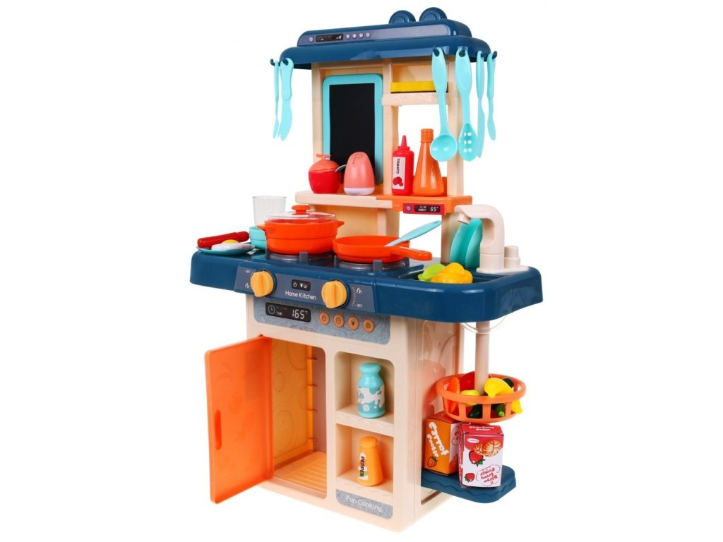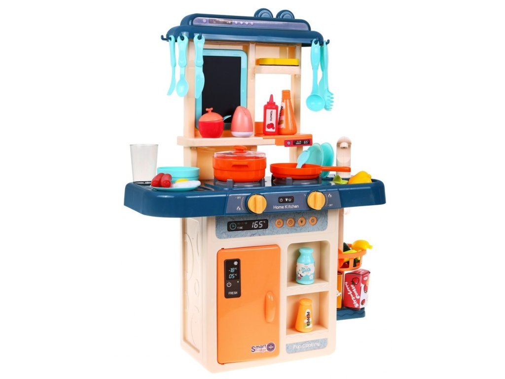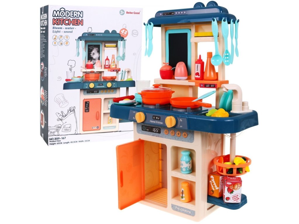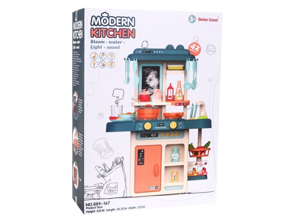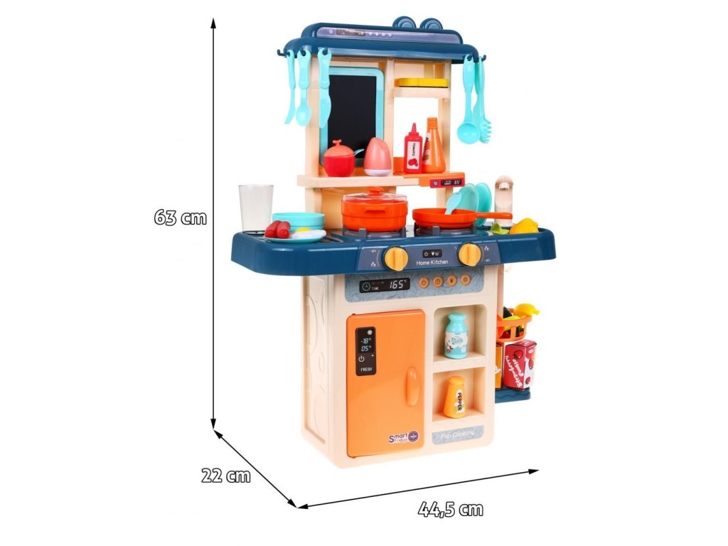 Детски кухненски комплект, състоящ се от 42 елемента. В кухнята има мивка с кран, от който тече вода, два индукционни котлона, подвижни копчета, отварящ се хладилник, рафтове и много други кухненски аксесоари. Когато включите котлоните, ще чуете звуци на готвене, придружени от мигаща червена светлина. Интересно допълнение е описателната дъска, на която можете да пишете списъци за пазаруване или рецепти.