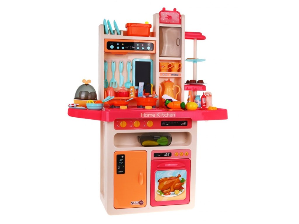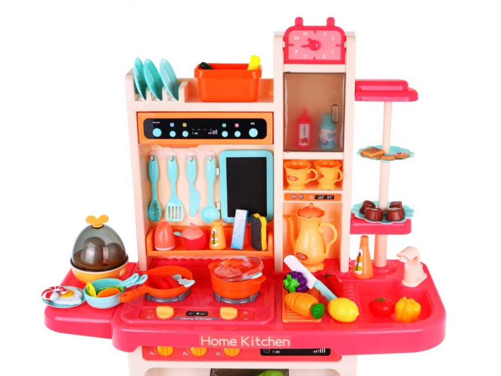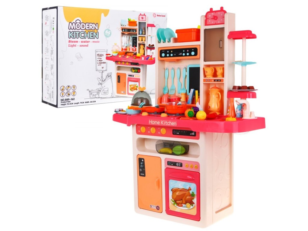 Мултифункционална детска кухня с аксесоари. Детската кухня XXL с мивка и дъска, 65 части разполага с мивка, към която може да се свърже течаща вода, осветени котлони със звуци на готвене и пържене и въртящи копчета. Детската кухня включва музикален панел и отваряема фурна, както и много аксесоари, хранителни продукти и съдове.