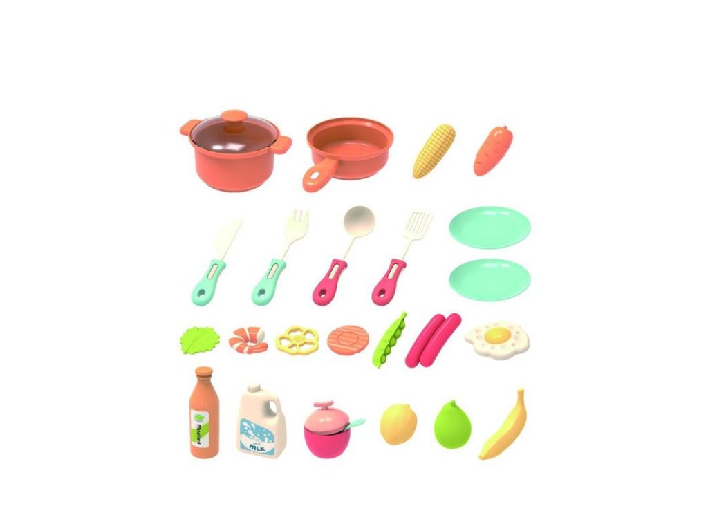 Заоблен дизайн на ъглите & Безопасност & Качество: Играчките за кухня имат заоблени ръбове и са изработени от безопасни, нетоксични материали. Комплектът включва 26 кухненски аксесоара, имитиращи храна и прибори, което позволява на децата да се насладят изцяло на удоволствието от готварската игра.