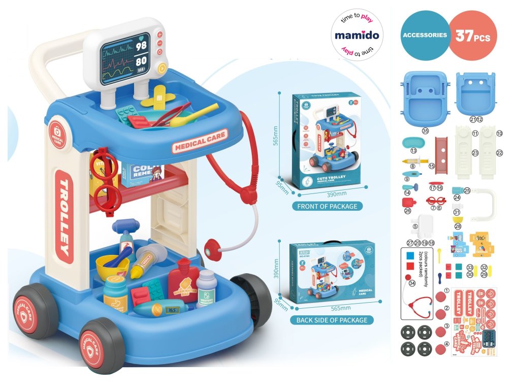 Комплектът на количката включва 37 части, включително стетоскоп, термометър, спринцовка, бутилки с витамини, лекарства, очила, превръзки и монитор за жизнени показатели. Благодарение на практичните колелца, децата могат лесно да пренасят количката и да играят на доктори навсякъде у дома.