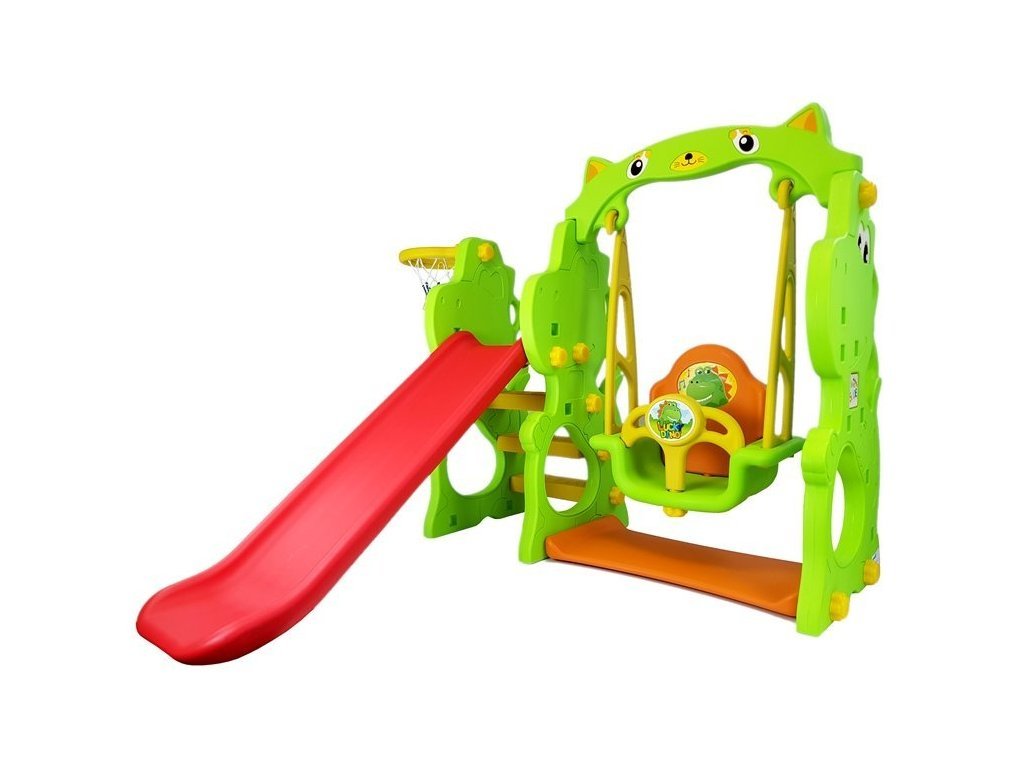 Детска люлка пързалка баскетболен кош 3в1 динозавър. Комплектът може да бъде сглобен по два начина – с коша отдясно или отляво. Пързалката може да се регулира според възрастта на детето. Подходяща за използване както на открито, така и на закрито. Всички стени и компоненти са изработени от двойна пластмасова структура. Препоръчвана възраст: от 1 година. Продуктът разполага с европейски сертификат за безопасност CE.