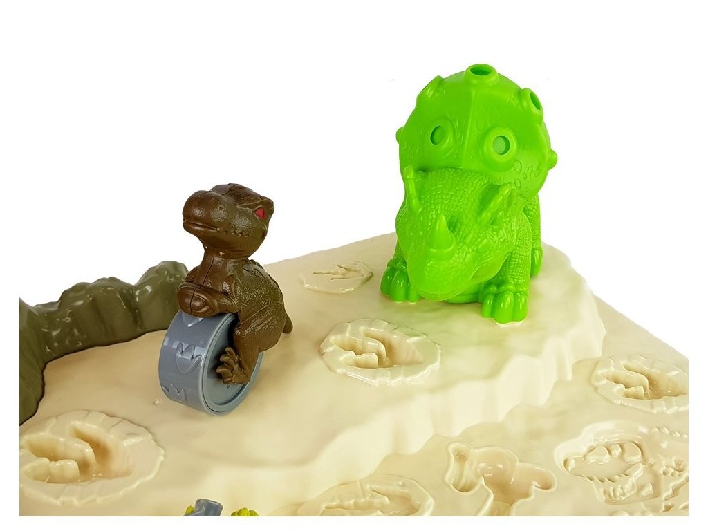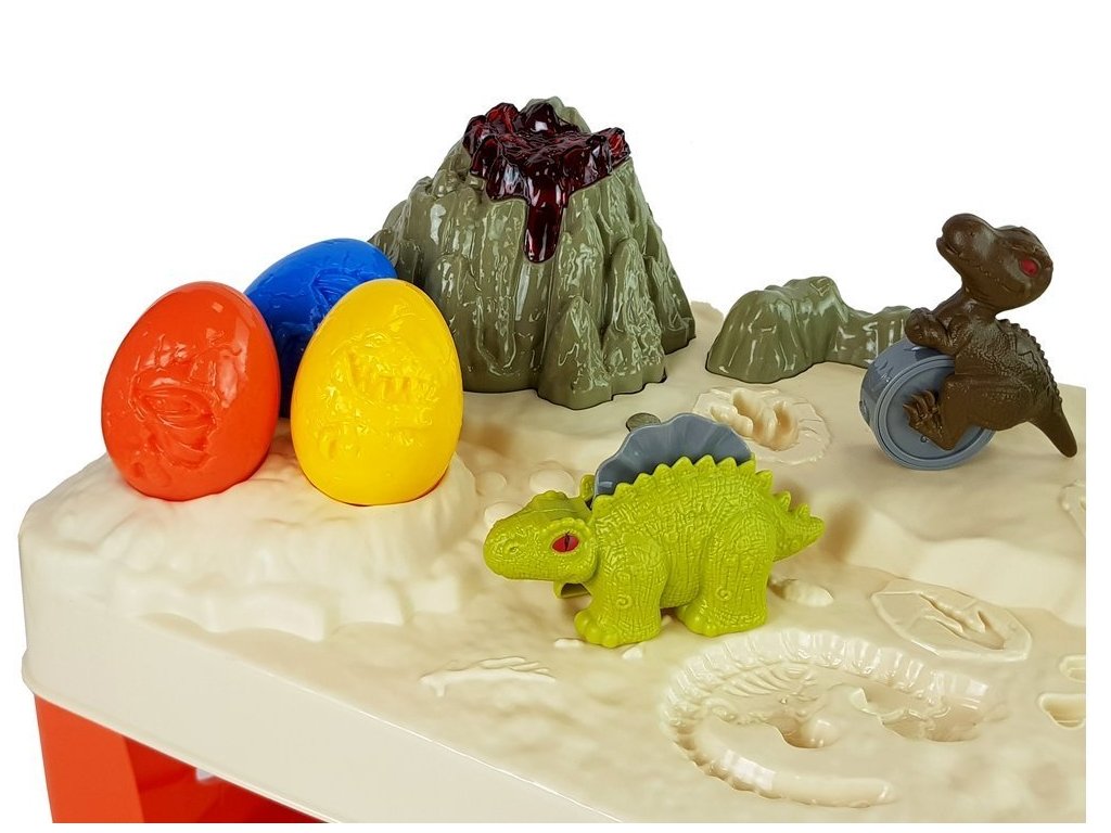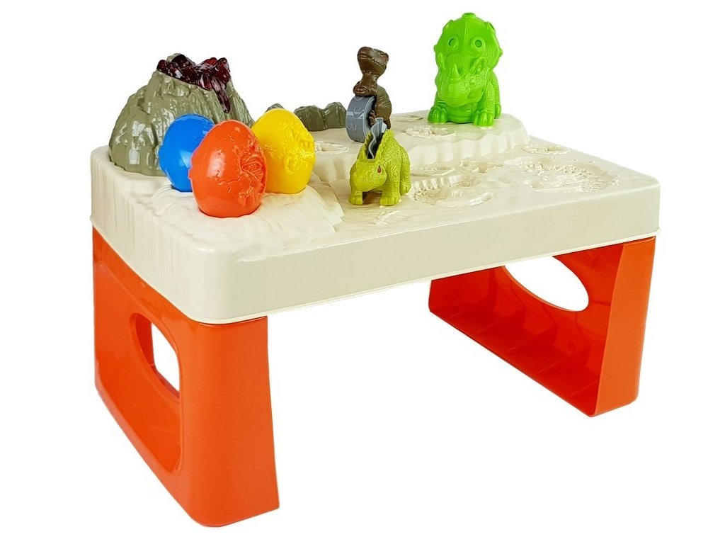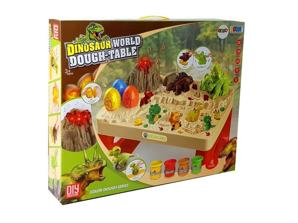 Детска масичка с пластелин динозаври е идеален подарък за всички малки любители на динозаврите. Играта стимулира детската креативност, фината моторика и подпомага развитието на координацията око-ръка. Комплектът позволява на децата да създадат свой собствен динозавър от пластилин, използвайки формички под формата на яйце. На масичката има вулкан, който след поставяне на батерии свети и издава звуци.