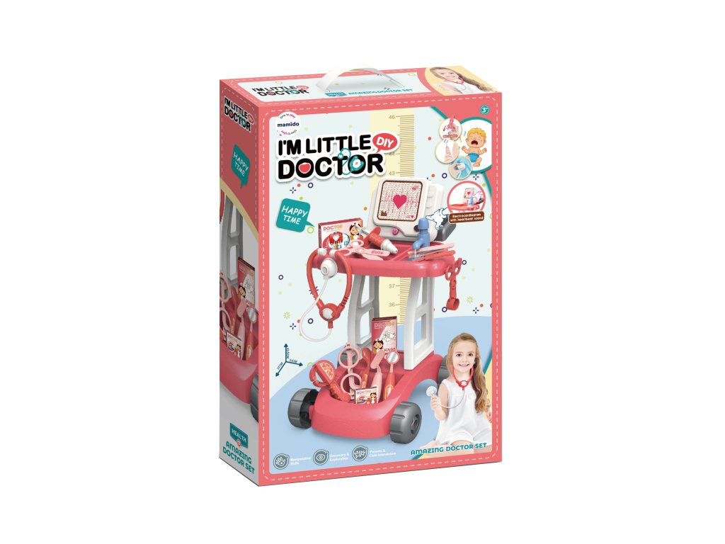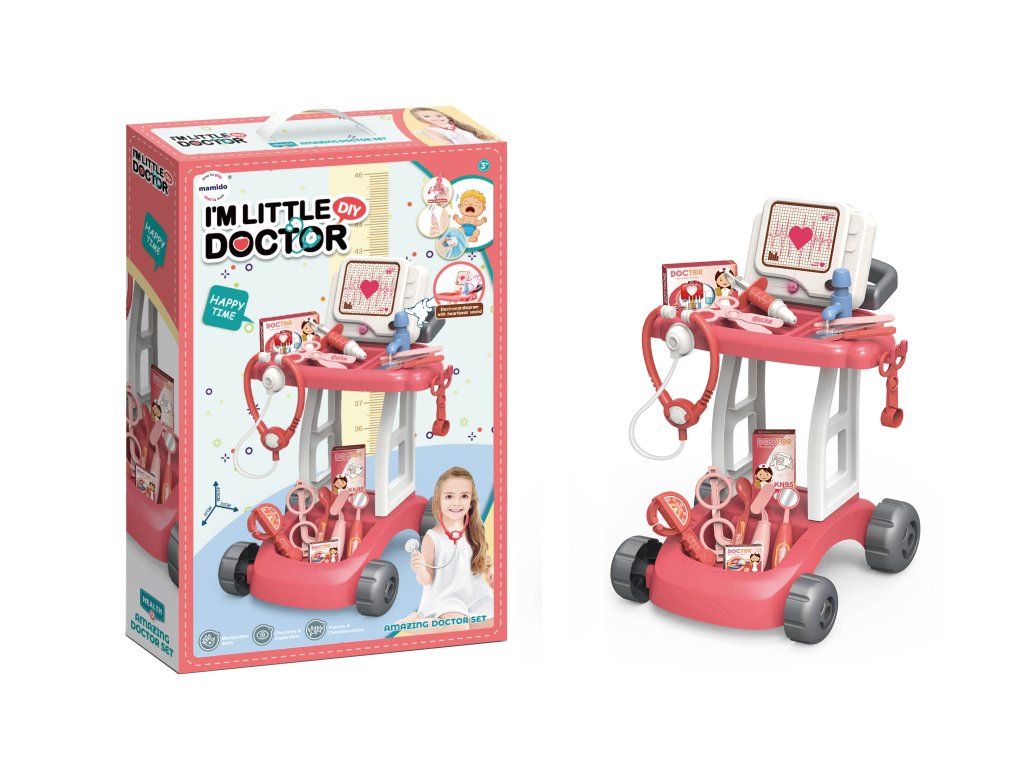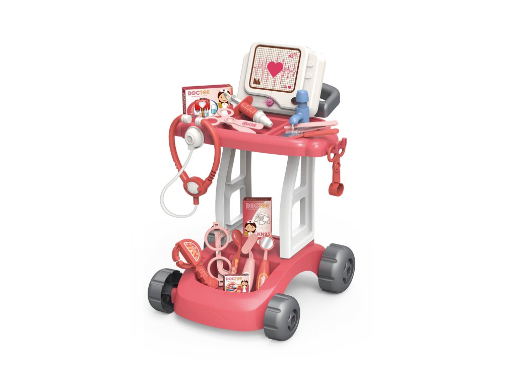 Тази медицинска количка предлага реалистични елементи като ЕКГ монитор с пулс, стетоскоп, спринцовка, очила или термометър. Количката е оборудвана с колелца, така че малкият лекар може лесно да се движи от пациент на пациент. Страхотна играчка, която насърчава въображението, емпатията и социалните умения на децата чрез ролева игра.