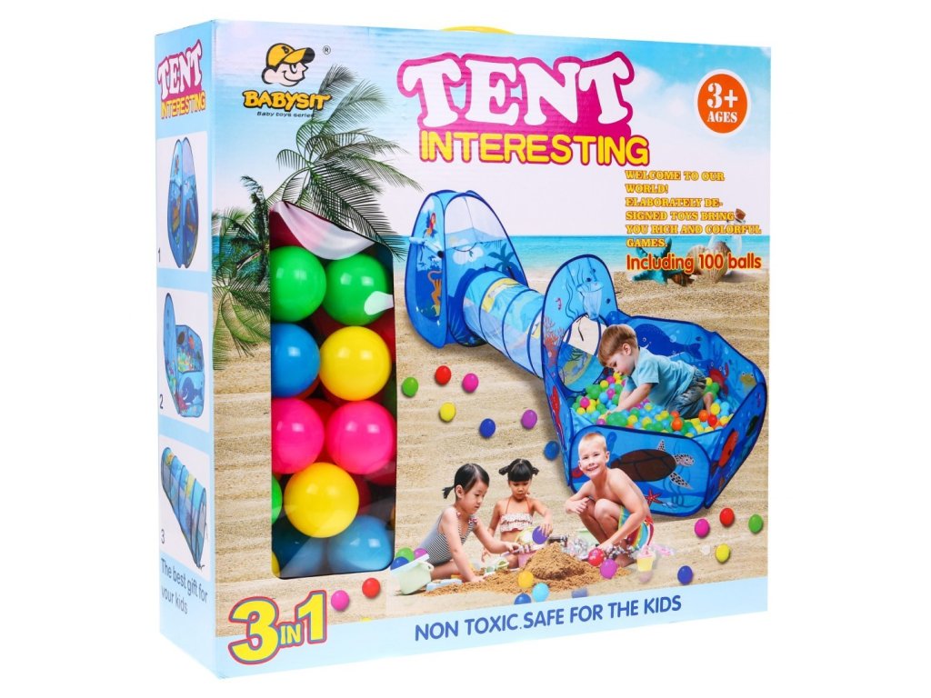 Детска площадка 3 в 1 под формата на сух басейн с топки, мини кош, тунел и палатка. Всеки от тези елементи може да бъде отделна игрова зона. Детска площадка се разгъва и сгъва за миг и заема малко място при прибирането си. Детската площадка е подходяща за игра както в детската стая, така и навън в градината.