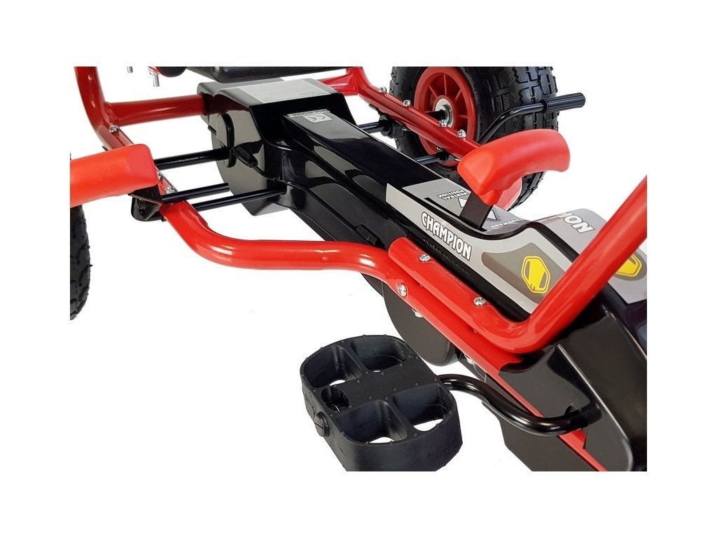 Детска педална мотокара Champion червена е висококачествено изработено детско педално превозно средство с модерен дизайн. Прецизно изработената метална конструкция в комбинация с качествена пластмаса гарантира, че мотокарата няма да е сезонен артикул. За безопасността на детето е включена функционална ръчна спирачка, а здравето му се поддържа и от високата облегалка на ергономично оформеното седалко. Седалката може да се регулира според удобството на вашето дете. Педалното превозно средство дава възможност на детето да се движи напред и назад. Колелата на мотокарата са изработени от омекотен гумено-пластмасов материал, което осигурява отлично сцепление с повърхността. Детската педална мотокара е отличен начин за движение и забавление на децата. Благодарение на човешкото задвижване е екологично чиста и безшумна.