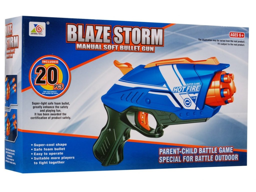 Бърз и точен детски пистолет, който се зарежда с 10 пянни патрона, които не причиняват болка на никого. Те са меки и без остри ръбове, затова няма опасност от нараняване. Пистолетът стреля на разстояние до 10 м. Компактен, лек и издръжлив пистолет. Под спусъка има пълнител за 4 патрона. С този пистолет децата няма да скучаят – организирайте истинска стрелба у дома, в която със сигурност ще се включат и татковците, връщайки се в детските си години заедно със синовете си. В нашата оферта предлагаме и други модели пистолети от марката Blaze Storm.