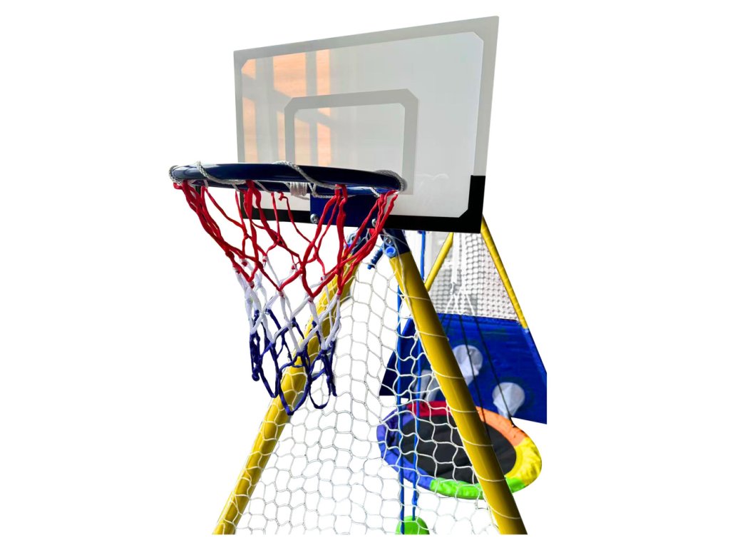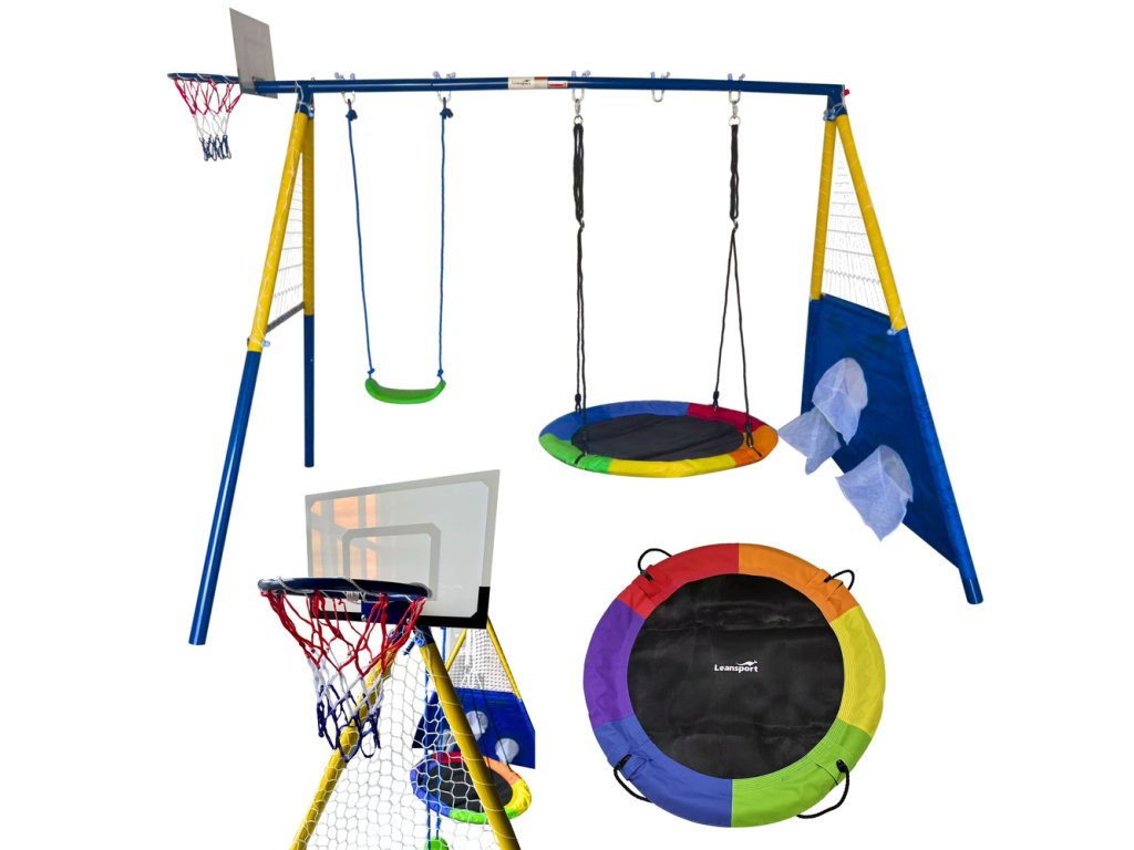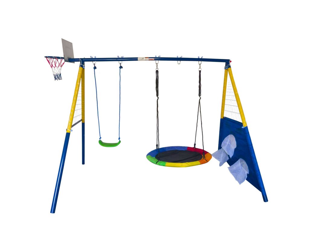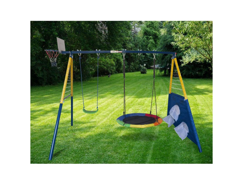 Този многофункционален градински комплект 4в1 е чудесно решение за активни забавления на открито за деца от 3 години. Предлага до четири различни възможности за игра: две люлки, баскетболен кош с топка и стена за мишена с футболна топка. Здравата стоманена конструкция с прахово покритие осигурява дълъг живот и устойчивост на атмосферни влияния. Благодарение на CE сертификата и инструкциите, сглобяването е безопасно и лесно.