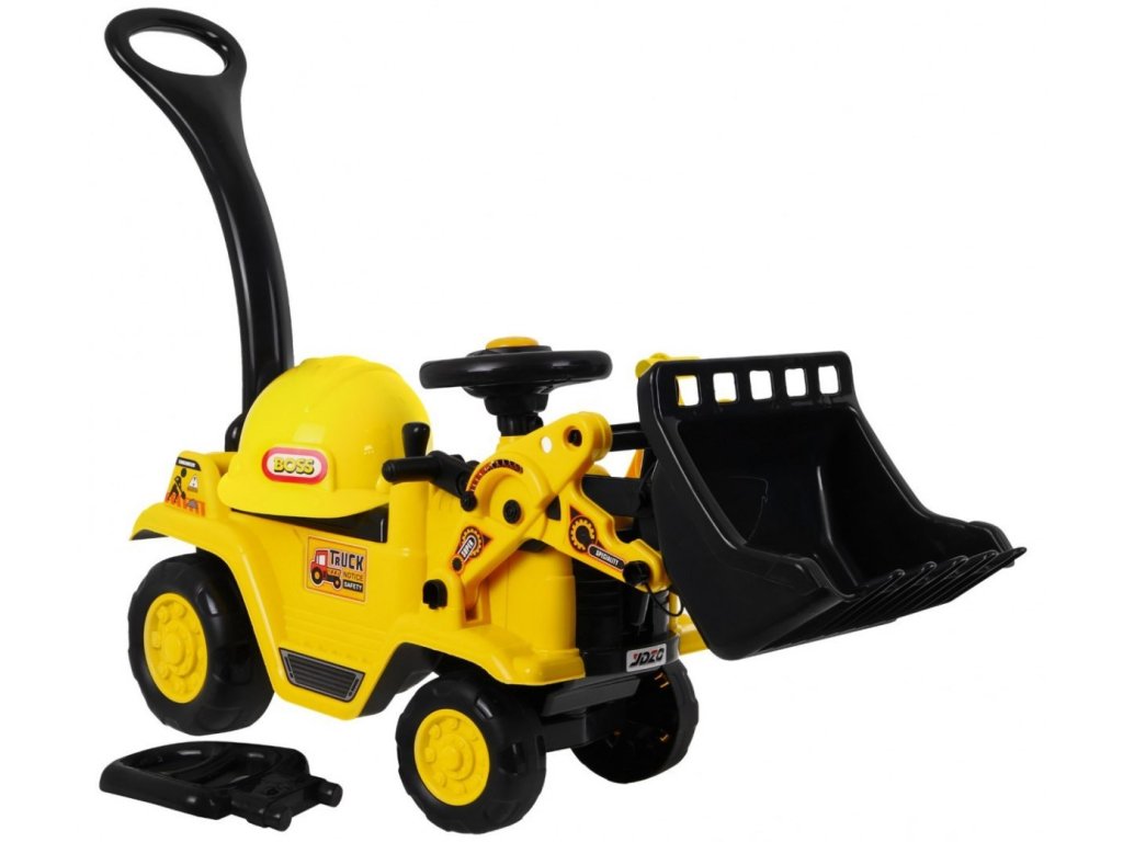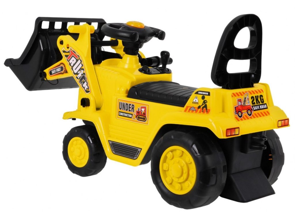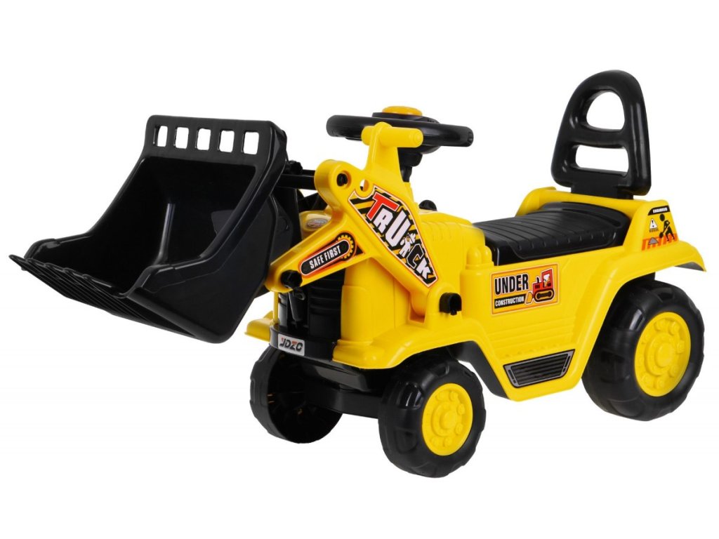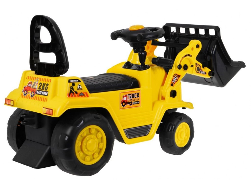 Детска проходилка товарач + каска - Разопаковано се движи на колела, допълнително защитени отвън с пластмасови покрития. Лостът се използва за управляване на самата лъжица (можем да залагаме пясък). Превозното средство има въртящ се механизъм на самия багер, без да се движи основата. В комплекта е включена каска – задължителна за всякакви строителни дейности. Играчката е изработена от висококачествена пластмаса.