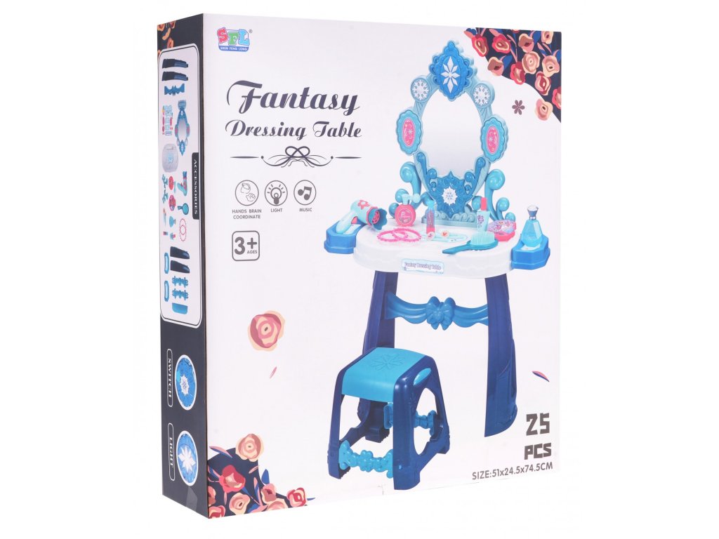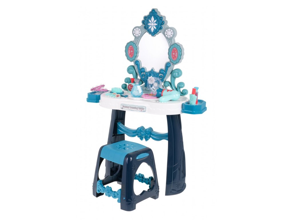 Детска тоалетка с аксесоари синя с огледало, столче и аксесоари за малки принцеси от 3 години. Играчката разполага със звук и светлинни ефекти (примигваща звезда над огледалото и две звезди отстрани). Работи с 3 батерии AA 1,5 V (не са включени в комплекта). Включва сешоар, четка и гримове – играчка.
