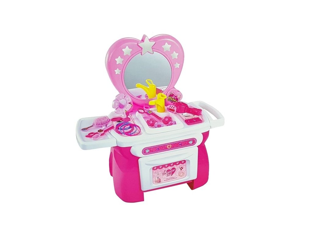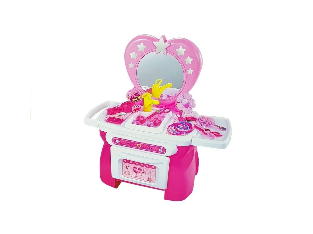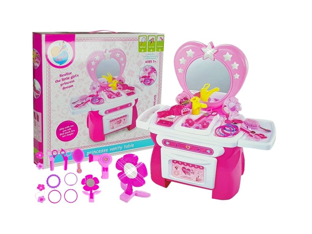 Всяка малка принцеса мечтае за свое местенце, където да се грижи за своя външен вид за различни поводи. Детската тоалетка с аксесоари за коса е розова и е украсена със звездички и нежни момичешки елементи.