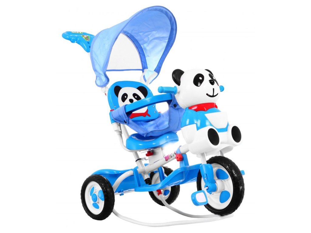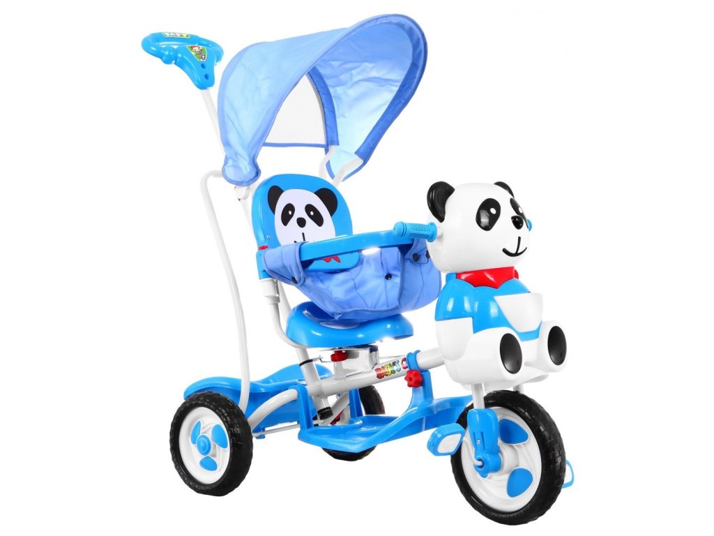 Дизайнерска детска триколка Panda със звукови ефекти синя, която може да служи и като количка. Държачът за управление е удобен за контрол върху движението на малките деца, за да не се отдалечават от Вас, като може да бъде свален. Под триколката има отделение за съхранение, което всяко дете и родител ще оцени, а отгоре има сенник, който предпазва от слънчевите лъчи. Подходяща за възраст от 1 до 5 години. Продуктът е с европейски сертификат за безопасност CE.