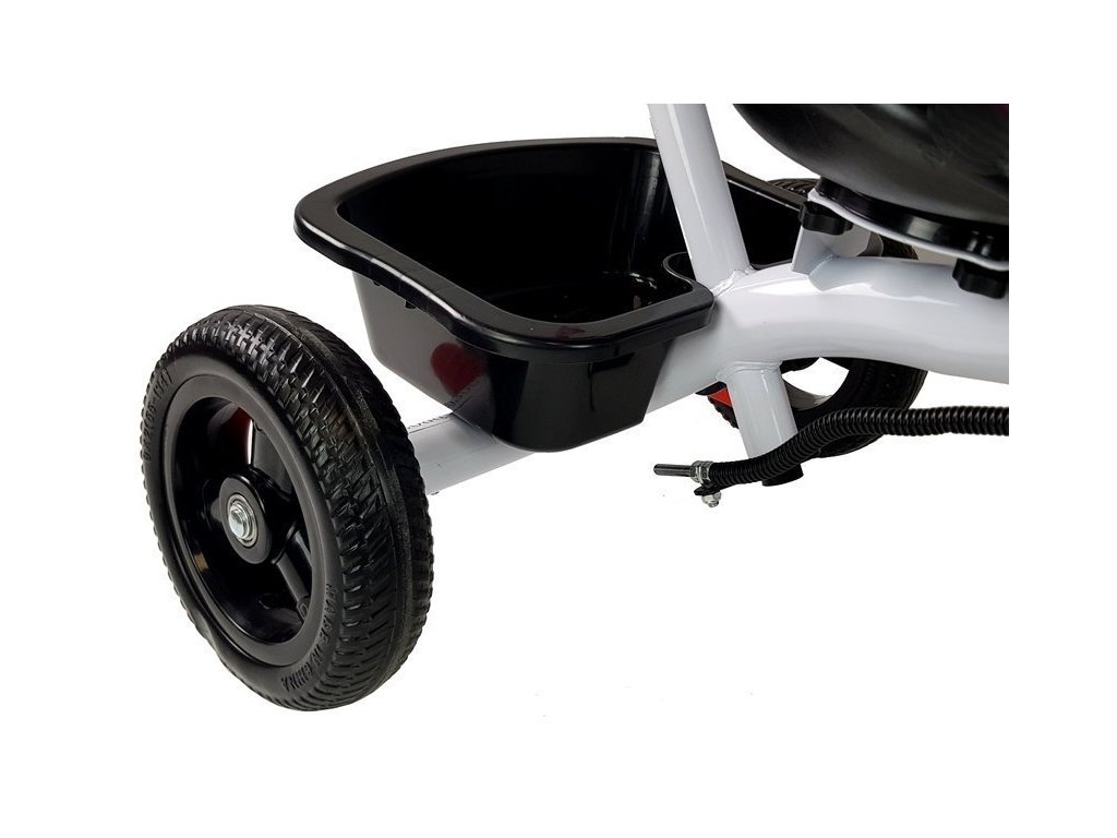 Детската триколка разполага с просторно кошче за играчки, покупки или детски принадлежности. Освен това е снабдена с калник на предното колело, удобна дръжка и предпазен колан. Коланът осигурява сигурност на детето, като го държи в удобна позиция и елиминира риска от падане от седалката.