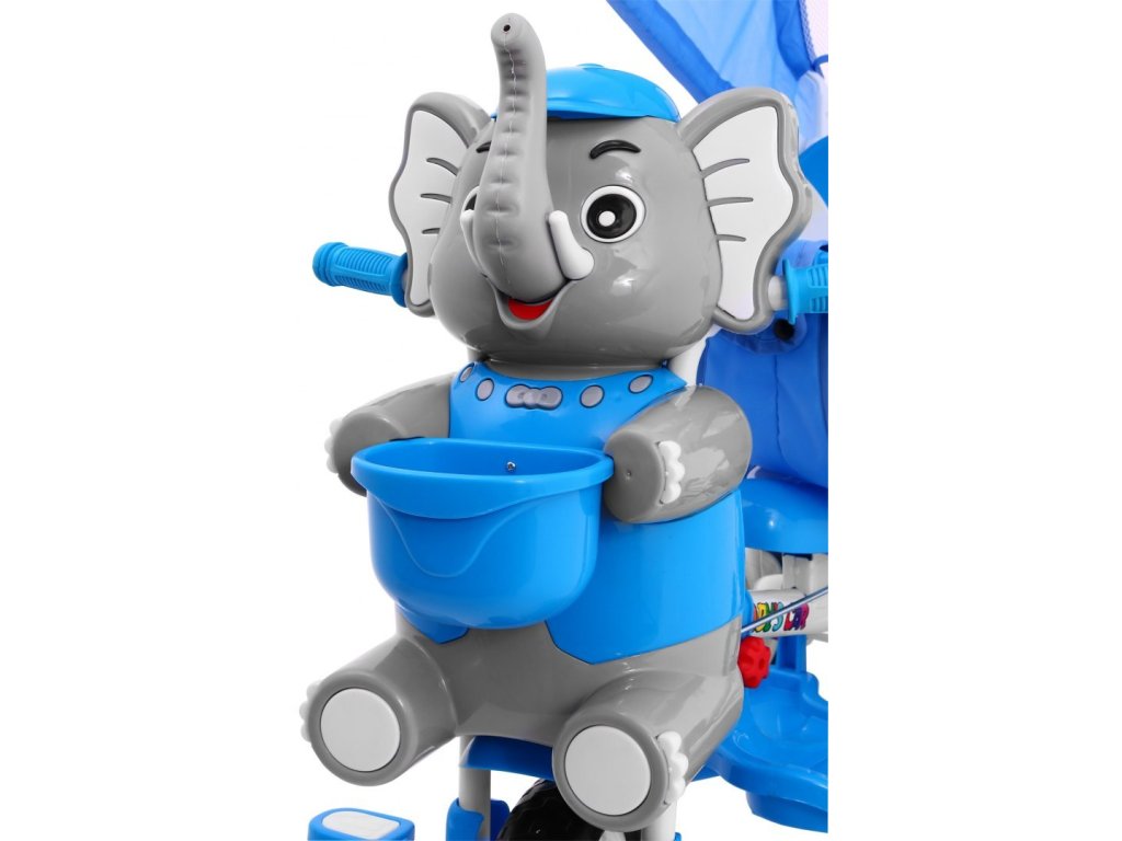 Детската триколка разполага с отделение за съхранение на играчки или детски закуски. На главата на слона детето може да играе с бутони, които издават забавни звуци.