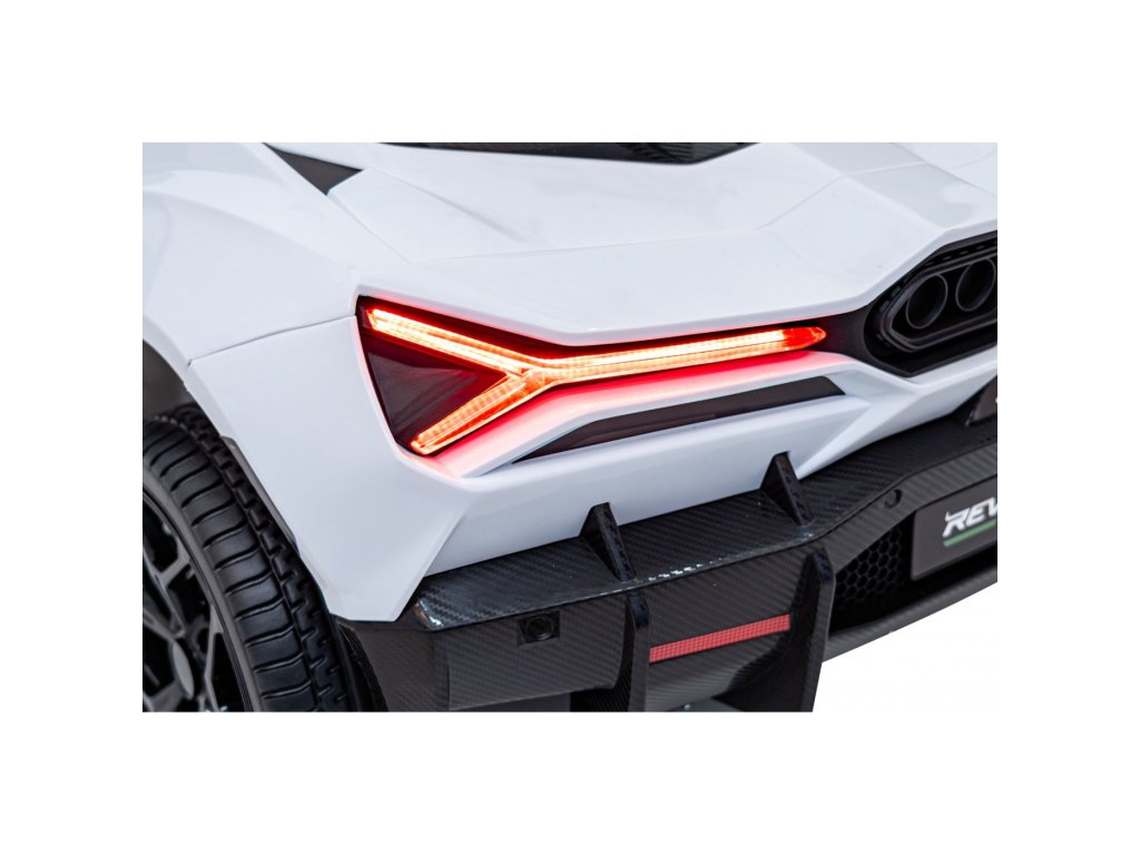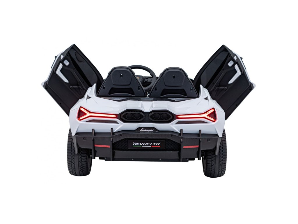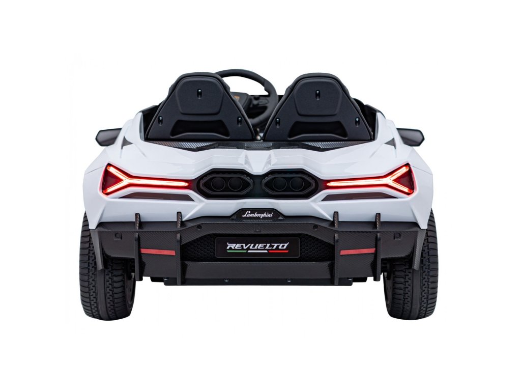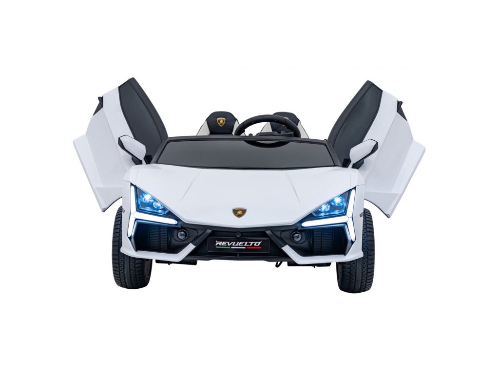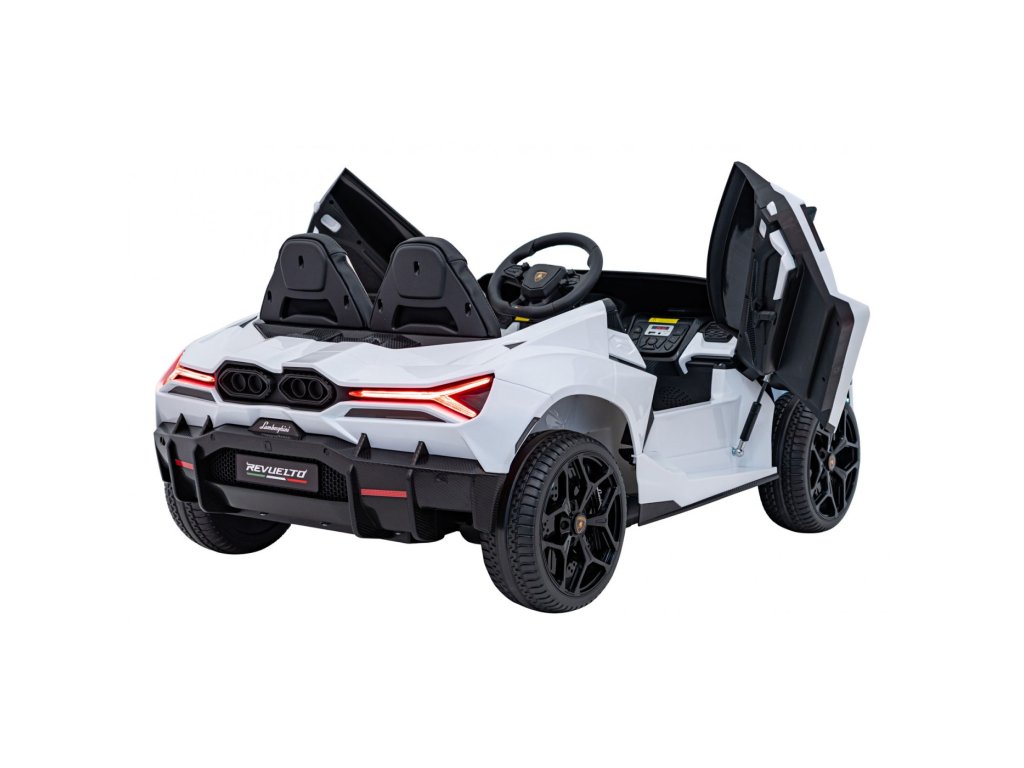 Детската електрическа кола Lamborghini Revuelto съчетава върхова производителност, комфорт и стил, верен на оригинала. Четири мощни мотора по 200 W, големи EVA колела от пяна и задното окачване осигуряват гладко возене по равна повърхност и лек терен. Двойната седалка, тапицирана с еко кожа с предпазни колани, LED осветление и отварящите се врати придават на автомобила реалистичен вид и безопасност.