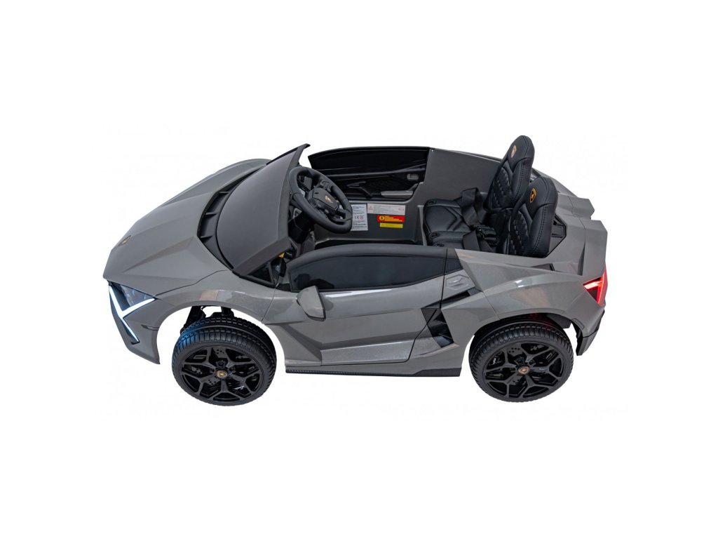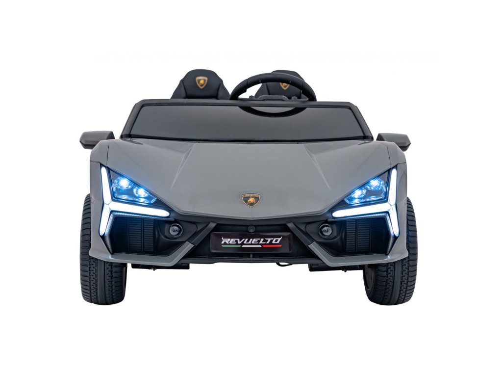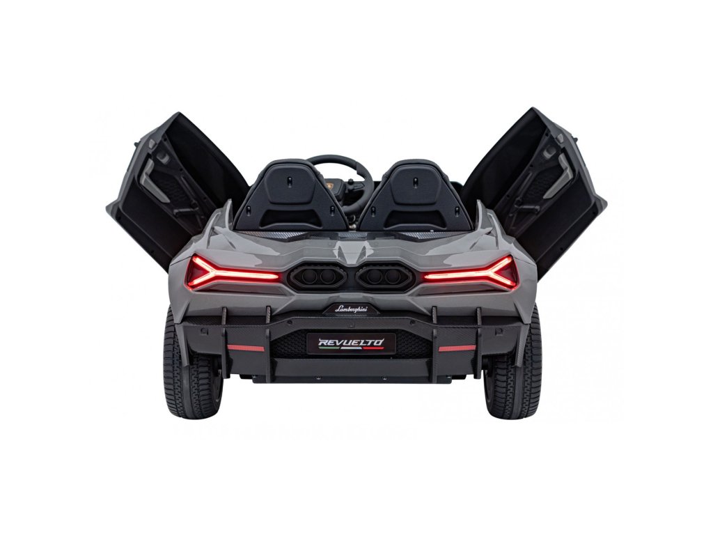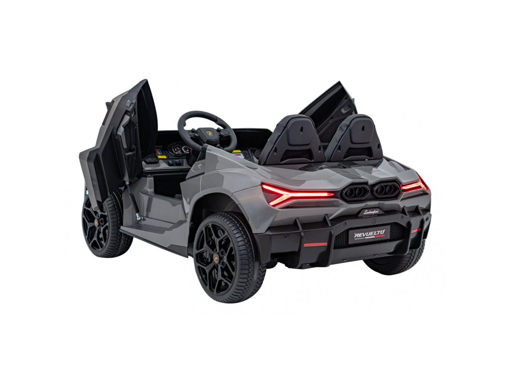 Детската електрическа кола Lamborghini Revuelto съчетава върхова производителност, комфорт и стил, верен на оригинала. Четири мощни мотора по 200 W, големи EVA колела от пяна и задното окачване осигуряват гладко возене по равна повърхност и лек терен. Двойната седалка, тапицирана с еко кожа с предпазни колани, LED осветление и отварящите се врати придават на автомобила реалистичен вид и безопасност.