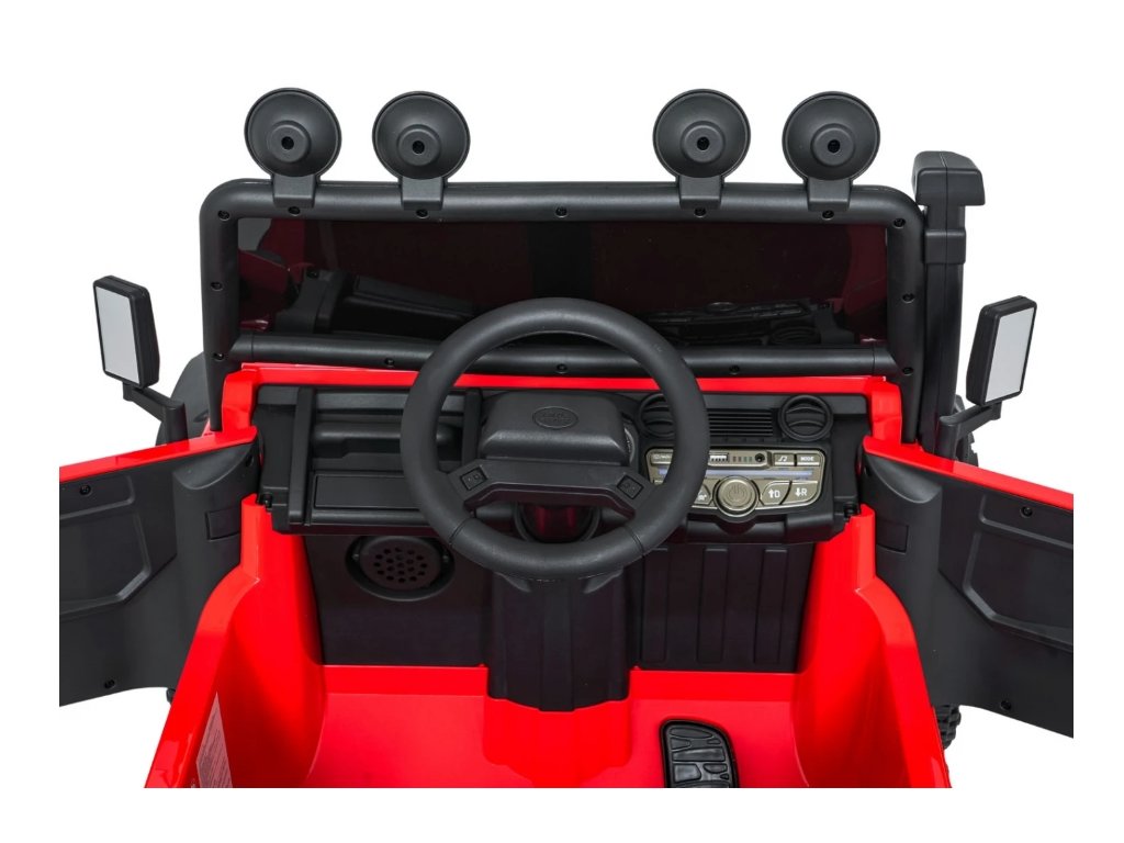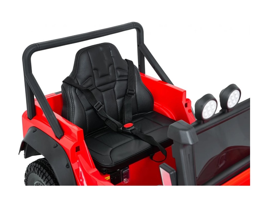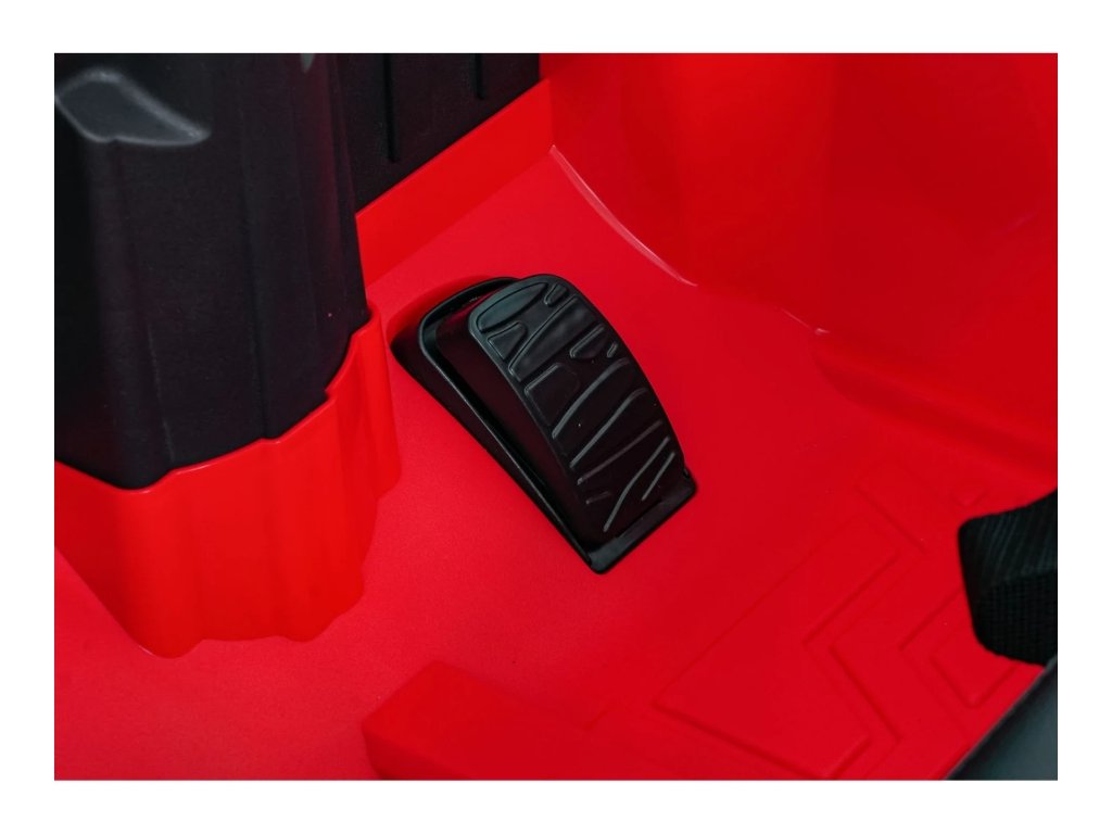 Едноместна седалка от еко кожа с триточков предпазен колан осигурява безопасност, докато LED осветлението, отварящите се врати и звуковите ефекти допринасят за реалистично изживяване при шофиране. Музикалният панел с MP3, Bluetooth, AUX и USB вход позволява възпроизвеждане на любима музика.