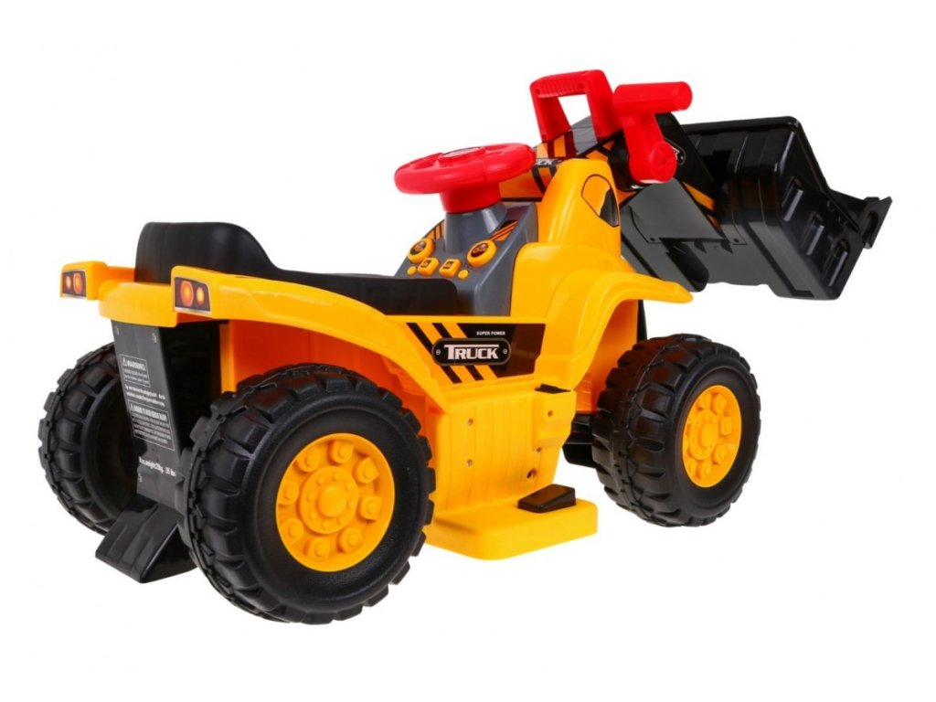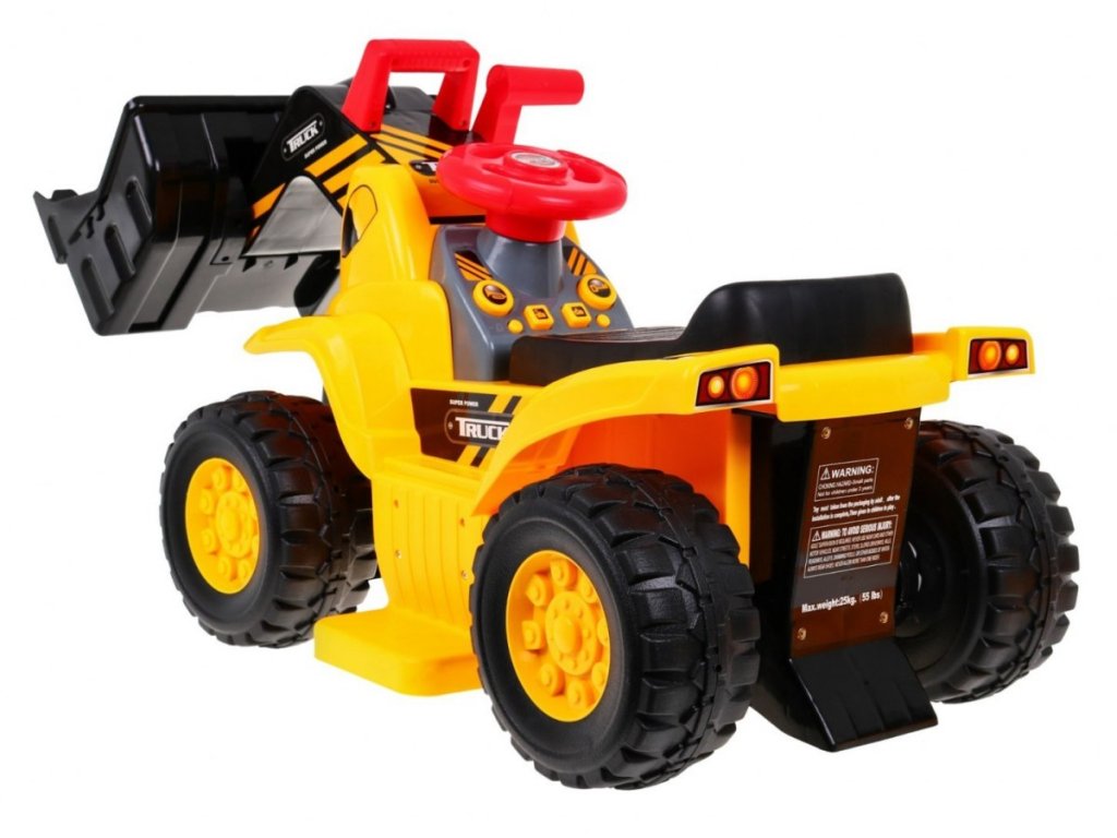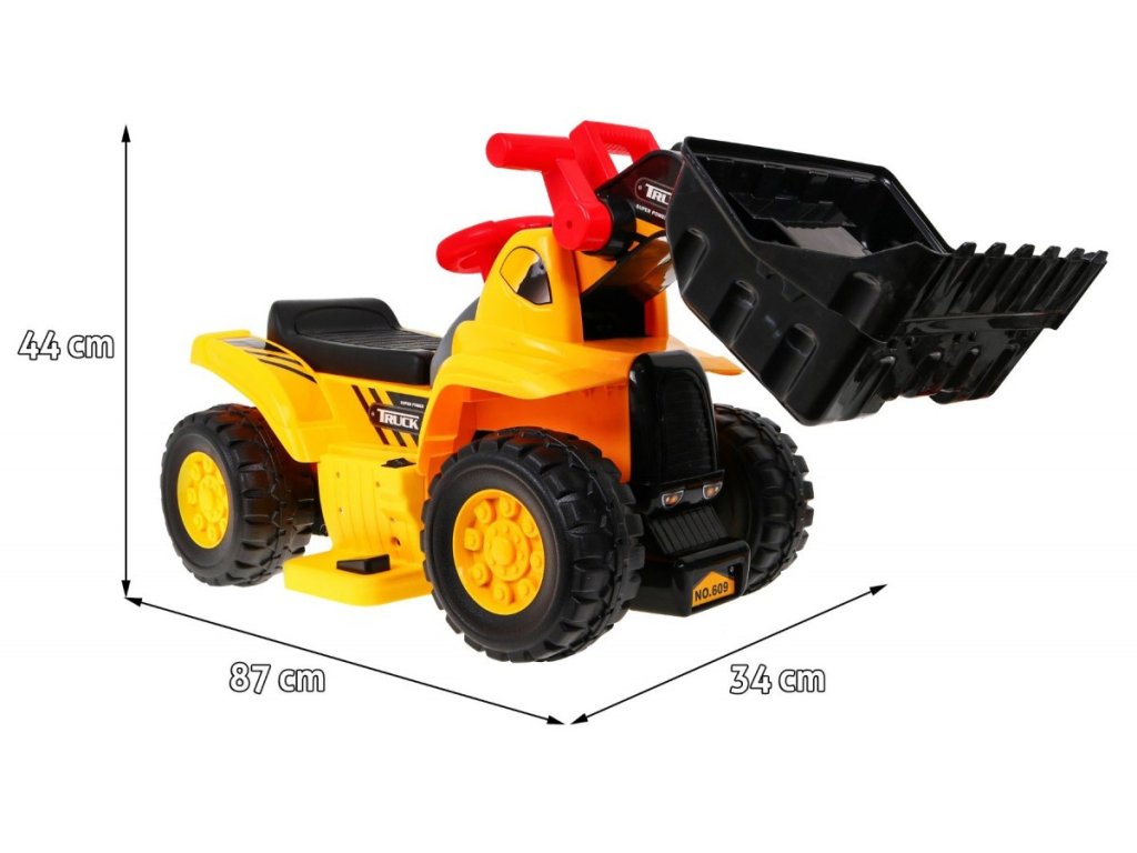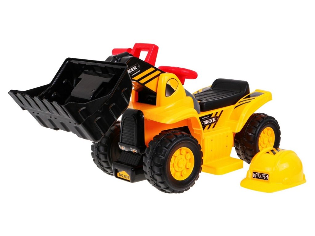 Детски акумулаторен челен товарач с каска, с който вашето дете може да играе както вкъщи, така и навън. Превозното средство се захранва с батерия, движи се напред, назад, наляво и надясно. Оборудвано е с големи стабилни колела, изработени от безопасни материали в ярки цветове.
