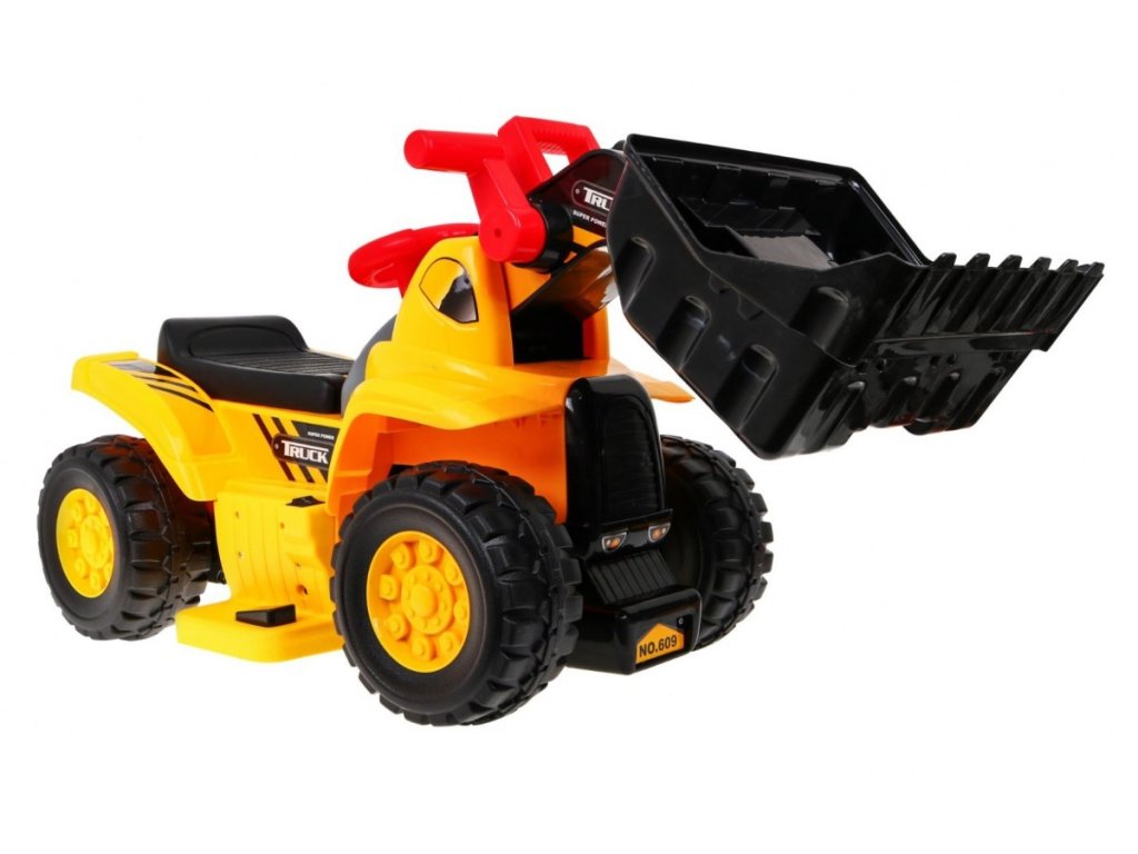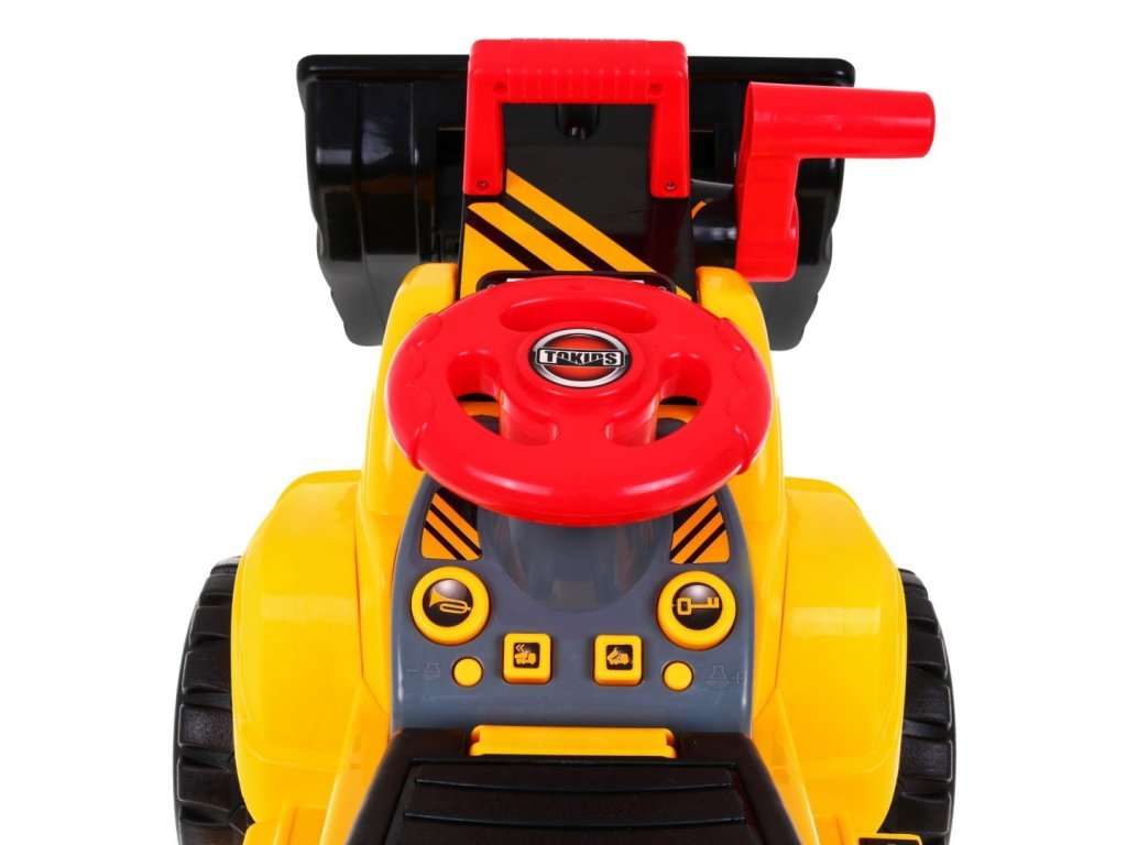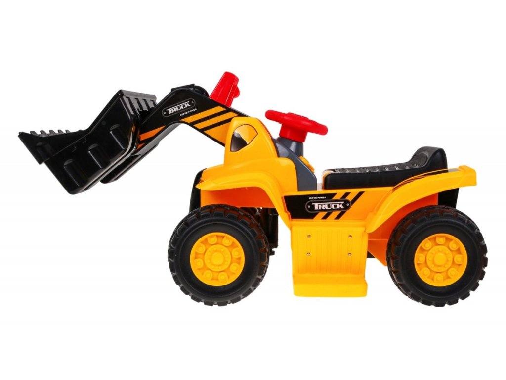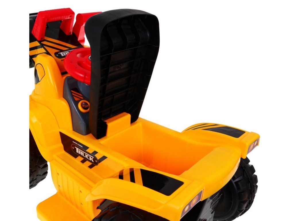 Детски акумулаторен челен товарач с каска, с който вашето дете може да играе както вкъщи, така и навън. Превозното средство се захранва с батерия, движи се напред, назад, наляво и надясно. Оборудвано е с големи стабилни колела, изработени от безопасни материали в ярки цветове.