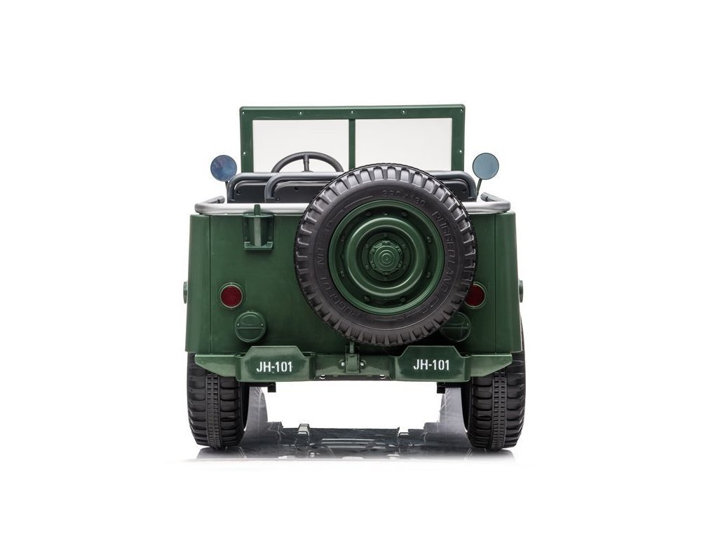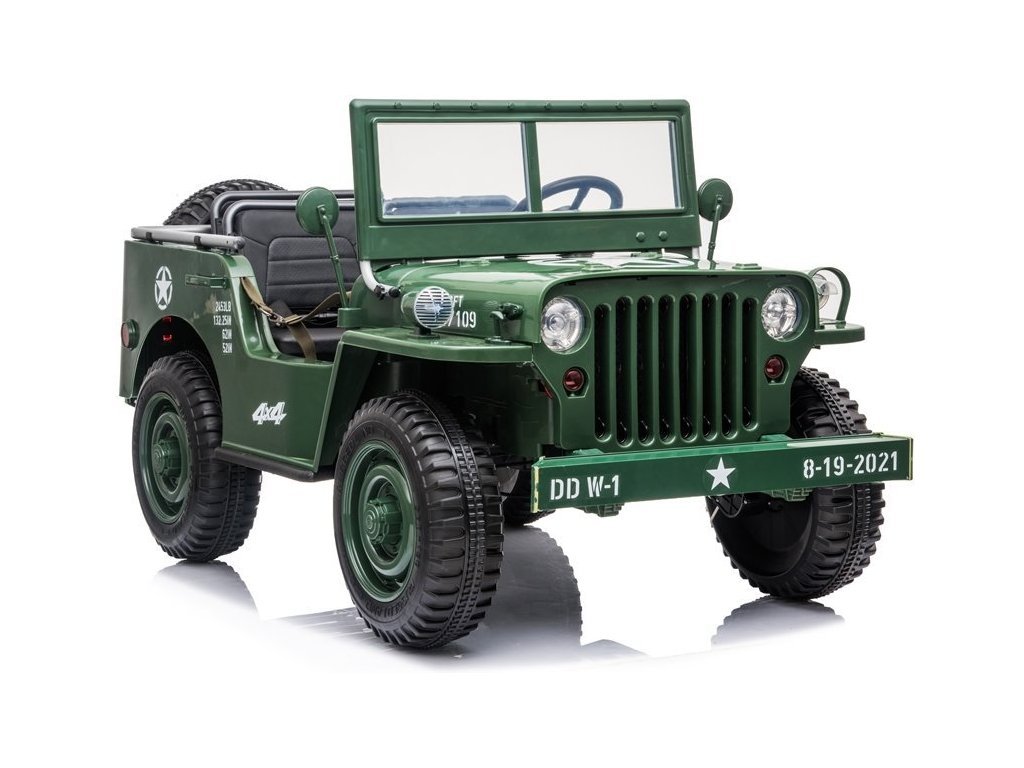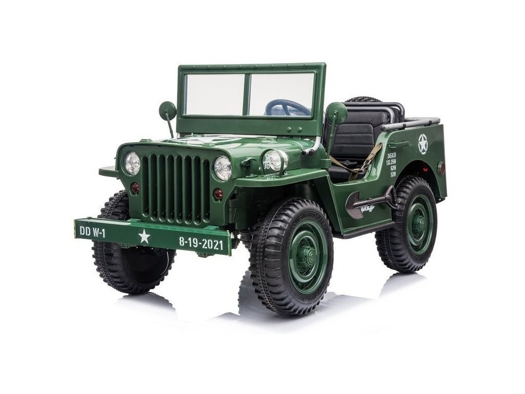 Детски военен електрически автомобил с пяна EVA гуми, които осигуряват адаптация към различни повърхности. Благодарение на задвижването на четирите колела, детето може да кара в пресечен терен. Военният Jeep Willys има товароносимост до 60 кг, което позволява на детето да вози приятел или брат/сестра. Пътуването ще бъде по-приятно с включените звукови и светлинни ефекти. На музикалния панел са налични USB и SD вход, както и възможност за свързване на MP3 или Bluetooth.