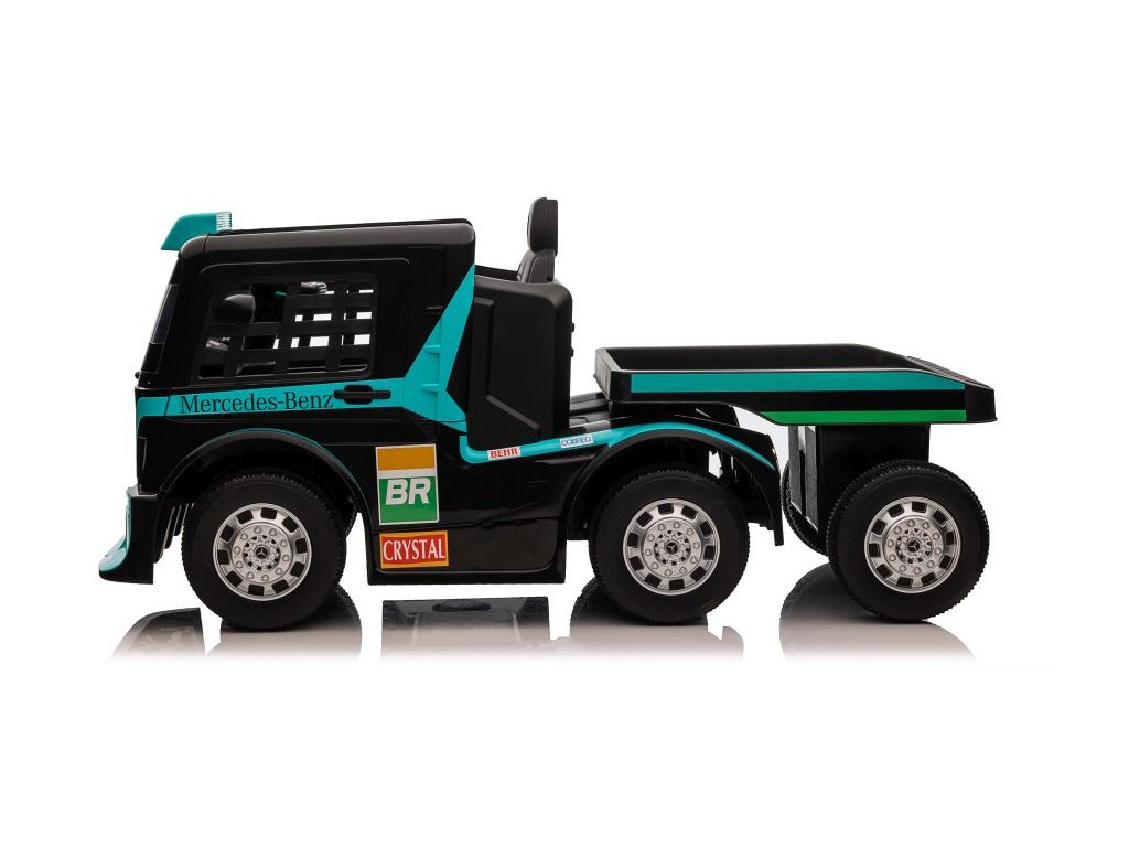 Детски акумулаторен камион Mercedes Axor LCD MP4 с ремарке тюркоазен с тъчскрийн LCD дисплей и удобна седалка от екологична кожа с предпазни колани. Детето може да управлява играчката самостоятелно, но родителите винаги могат да поемат контрол чрез дистанционно управление. Дистанционното разполага с бутони за смяна на посоката на движение във всички посоки и с бутон за аварийно спиране STOP, който незабавно спира превозното средство и изключва всички негови функции.