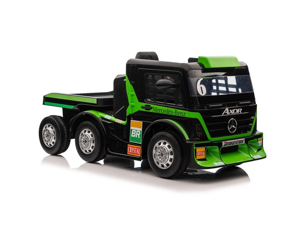 Детски акумулаторен камион Mercedes Axor LCD MP4 със зелен ремарке с тъч LCD дисплей и удобна седалка от екологична кожа с обезопасителни колани. Детето може да управлява камиона напълно самостоятелно, но родителите винаги могат да поемат контрол чрез дистанционно управление. Дистанционното разполага с бутони за движение във всички посоки и безопасен бутон STOP, който веднага спира превозното средство и изключва всички функции.