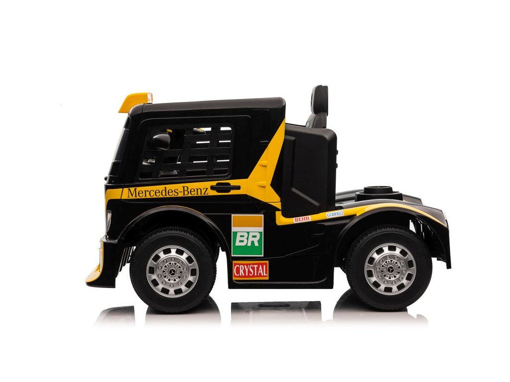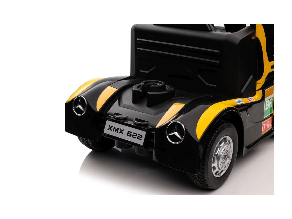 Детски акумулаторен камион Mercedes Axor LCD жълт с тъч LCD дисплей и удобна седалка от еко кожа с предпазни колани. Детето може да управлява колата напълно самостоятелно, но родителите могат по всяко време да поемат контрола чрез дистанционно управление. Дистанционното разполага с бутони за смяна на посоката на движение във всички посоки и с бутон за аварийно спиране STOP, който моментално спира автомобила и изключва всички функции.