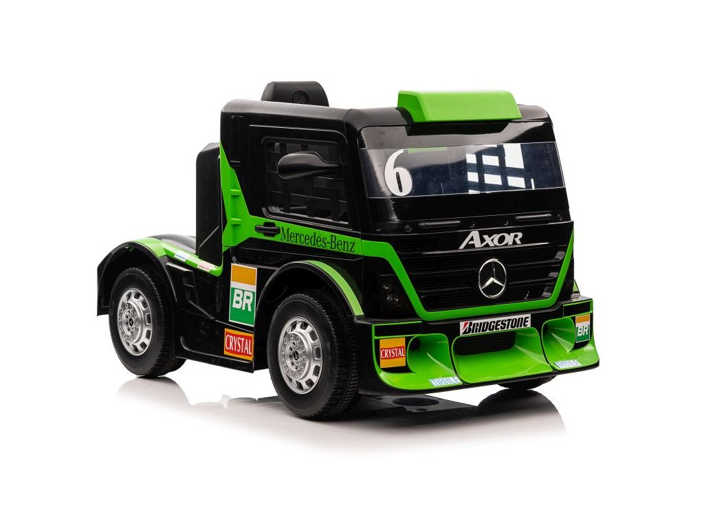 Детски акумулаторен камион Mercedes Axor с LCD зелен с тъчскрийн LCD дисплей и удобна седалка от екологична кожа с предпазни колани. Детето може да управлява камиона самостоятелно, но родителите винаги могат да поемат контрола с помощта на дистанционно управление. Дистанционното разполага с бутони за смяна на посоката на движение във всички посоки и с бутон за аварийно спиране STOP, който незабавно спира превозното средство и изключва всички негови функции.