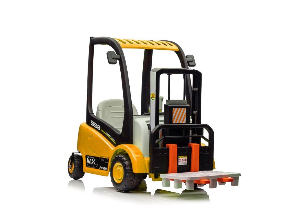 Детски акумулаторен мотокар XMX638 жълт е оборудван с два мотора с обща мощност 90W и широки гуми.