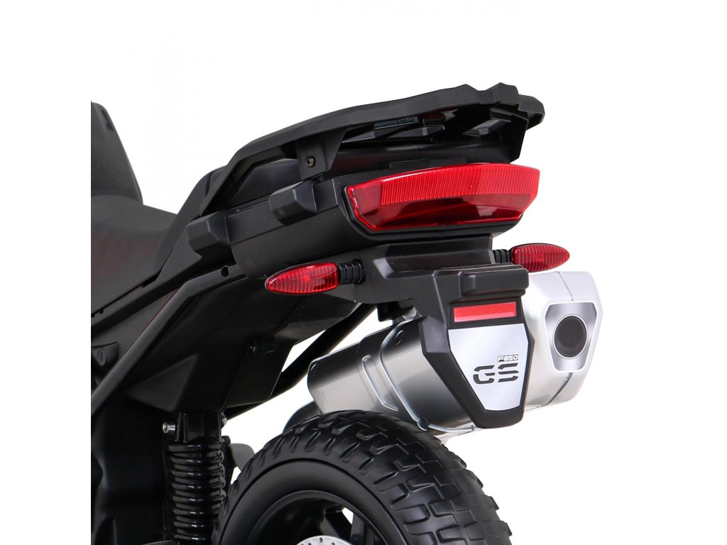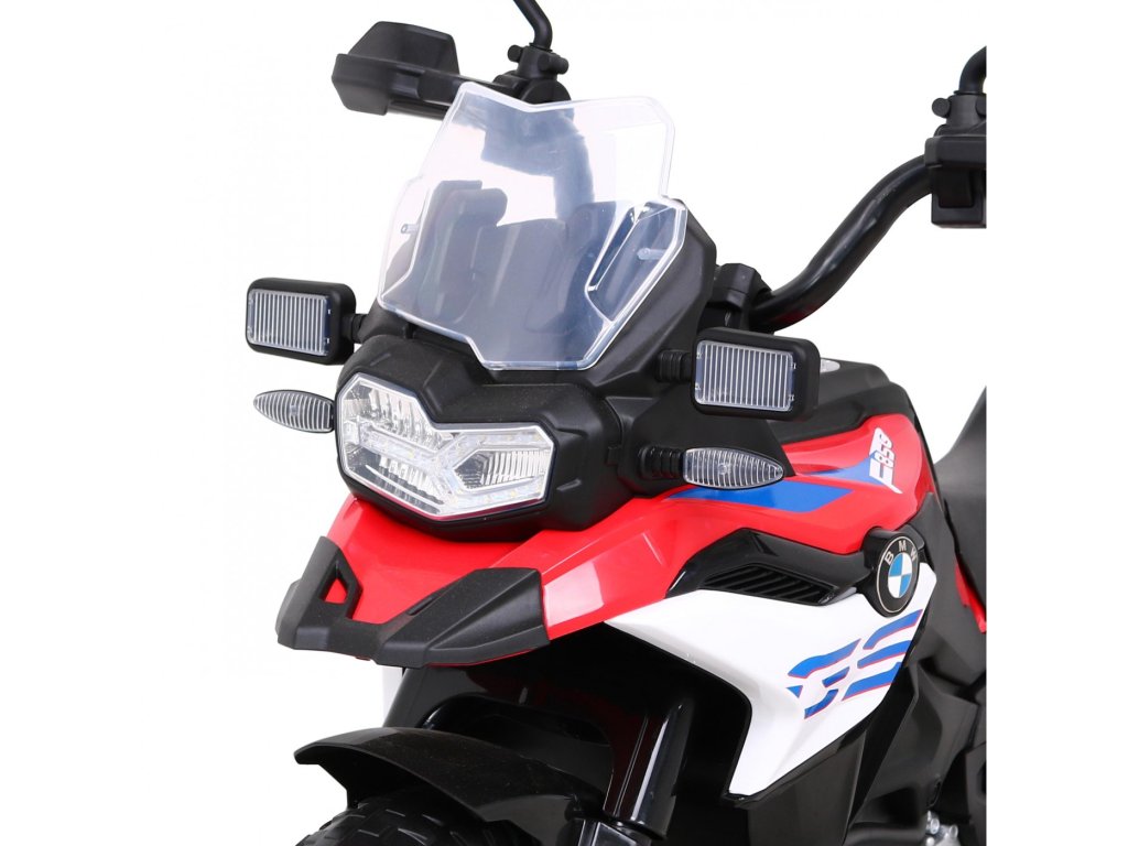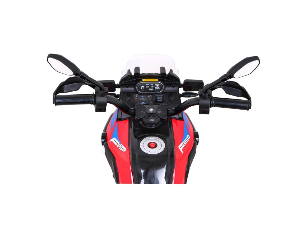 Детски акумулаторен мотор BMW F850 GS червен е оборудван с тихи EVA пеноплиумови гуми, които не създават шум по време на каране. Детето сяда на удобно оформеното седло, а звуковите ефекти, активирани чрез мултимедийния панел с входове MP3, AUX и USB, допълнително забавляват преживяването. Моторът разполага и с клаксон. BMW F850 GS е снабден с задни амортисьори и стабилизиращи странични колела.