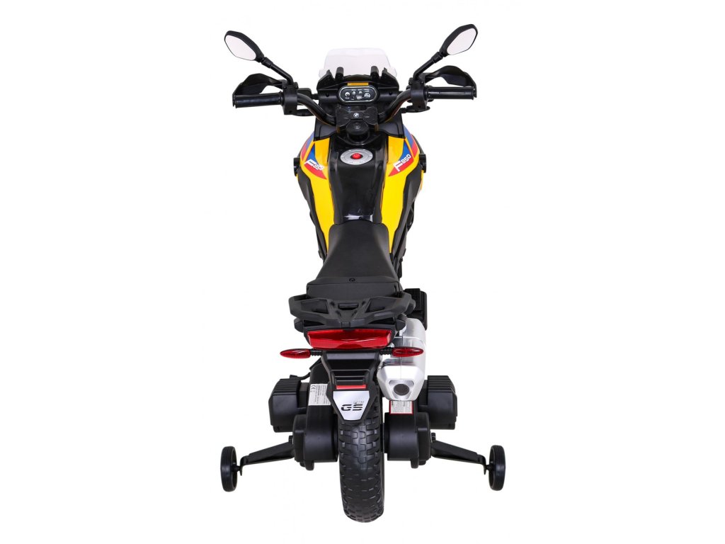 Детски акумулаторен мотор BMW F850 GS жълт пристига с тихи EVA пяна гуми, които осигуряват безшумно и плавно каране. Детето се настанява в удобно оформено седалка, а звуковите ефекти, които могат да се пускат чрез музикален панел с входове за MP3, AUX и USB, правят преживяването още по-забавно. Моторът е оборудван и с клаксон. BMW F850 GS разполага с задни амортисьори и странични помощни колела за допълнителна стабилност.