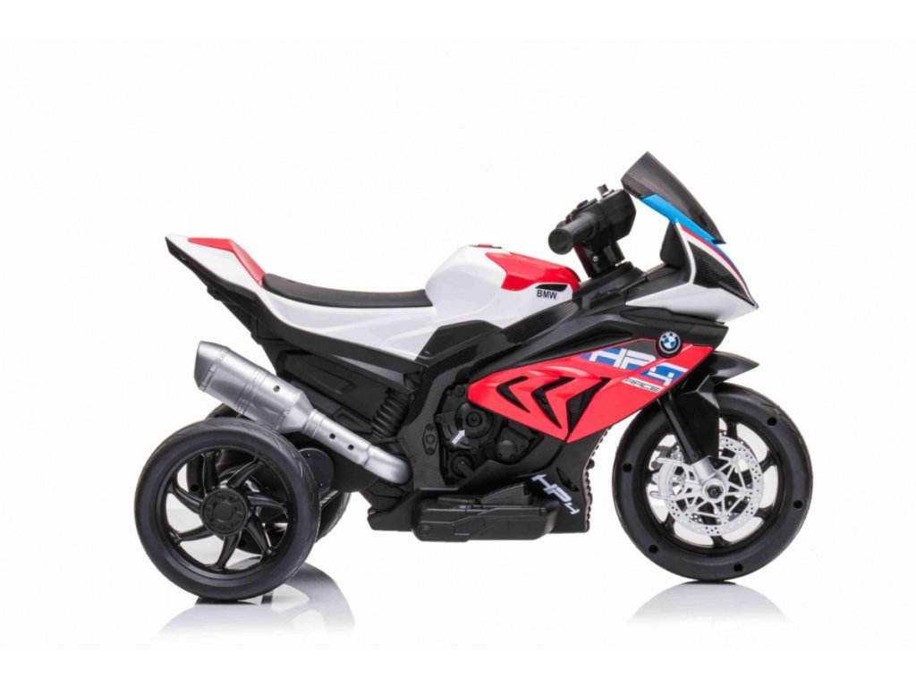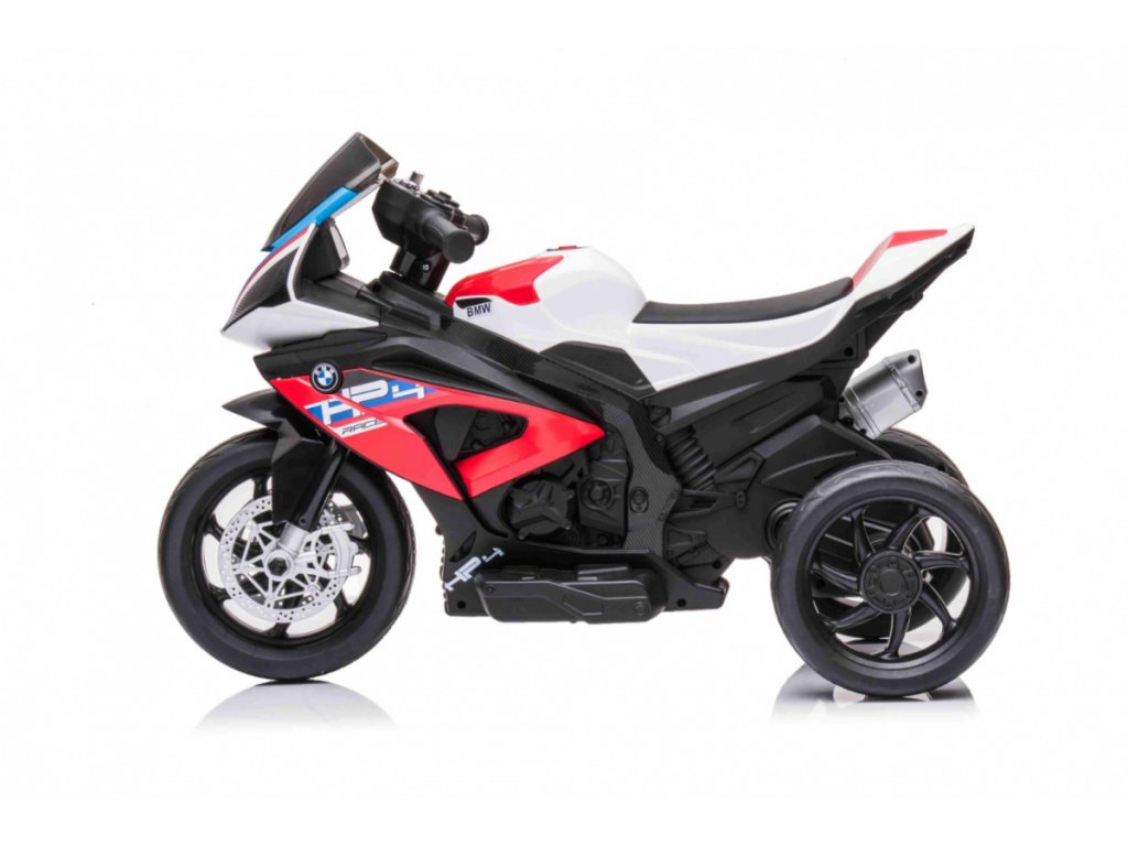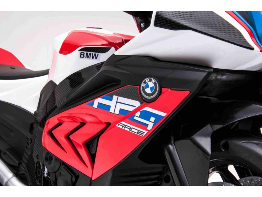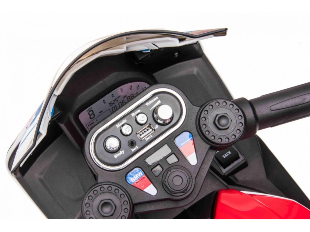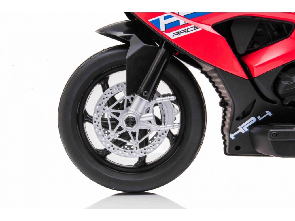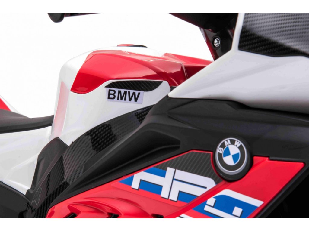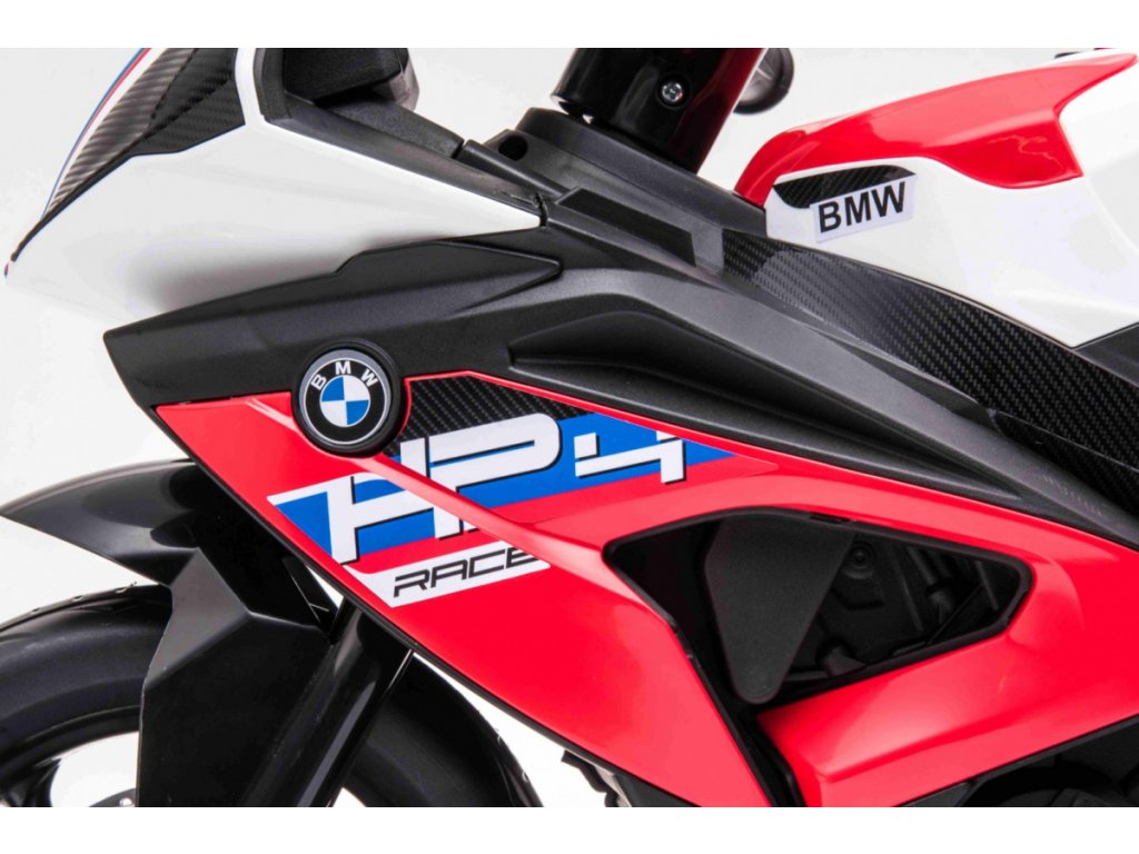 Детски акумулаторен мотор BMW HP4 червен с иновативен дизайн и богато оборудване. Музикален панел с входове за MP3, AUX и USB. Седалката е изработена от мека еко кожа.