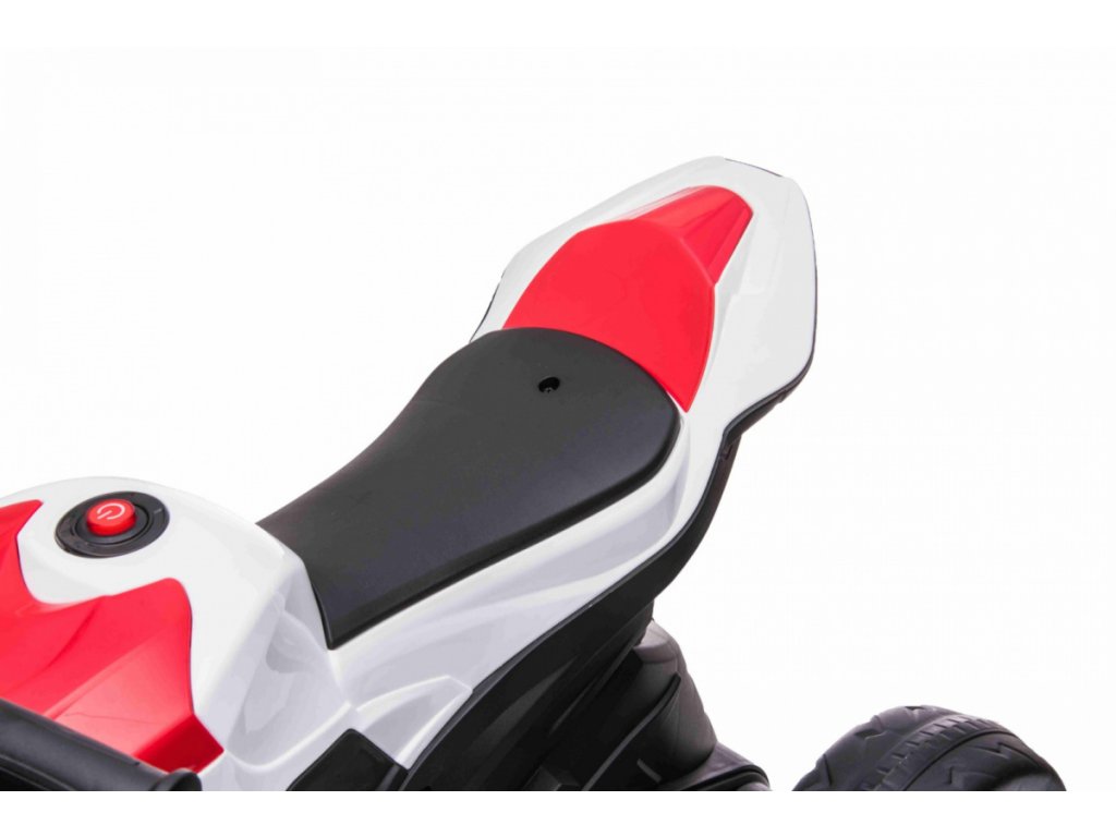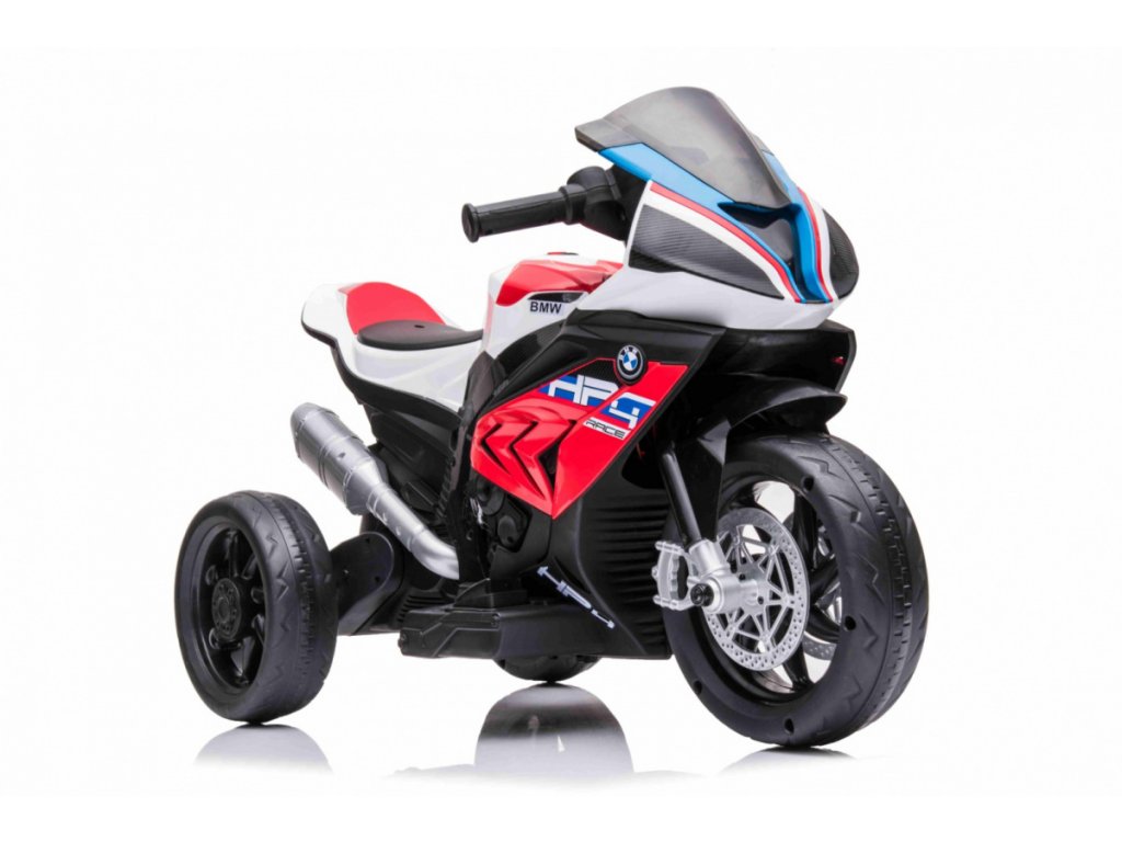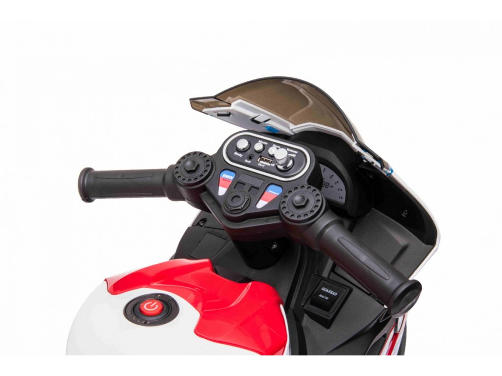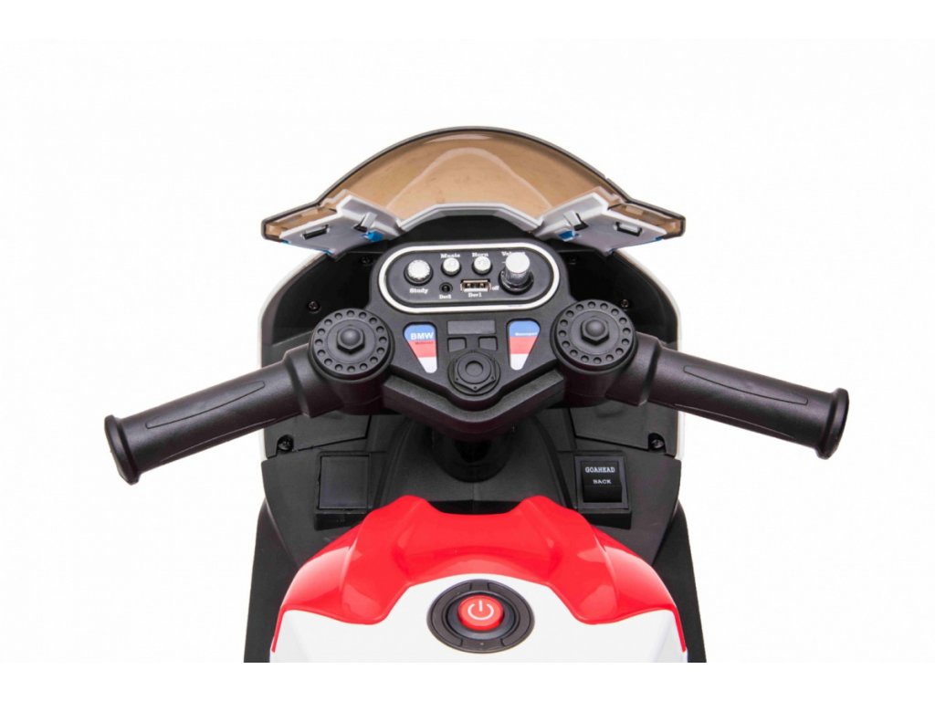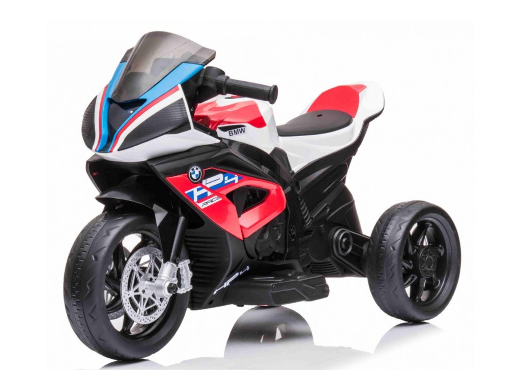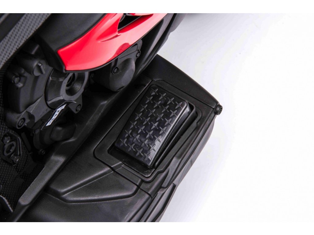 Детски акумулаторен мотор BMW HP4 червен с иновативен дизайн и богато оборудване. Музикален панел с входове за MP3, AUX и USB. Седалката е изработена от мека еко кожа.