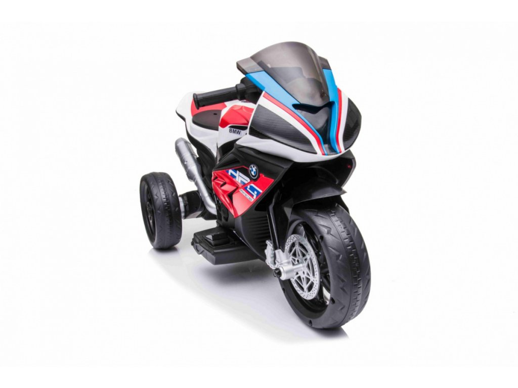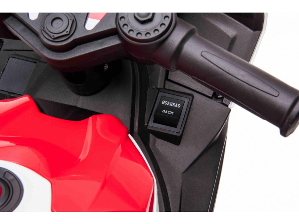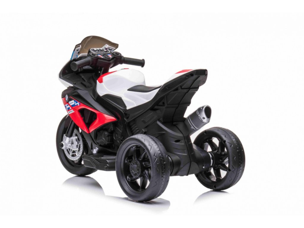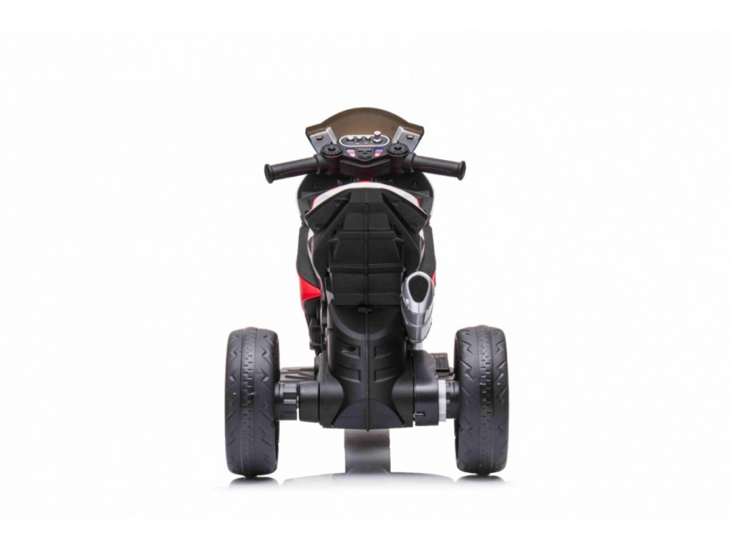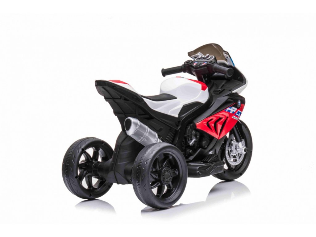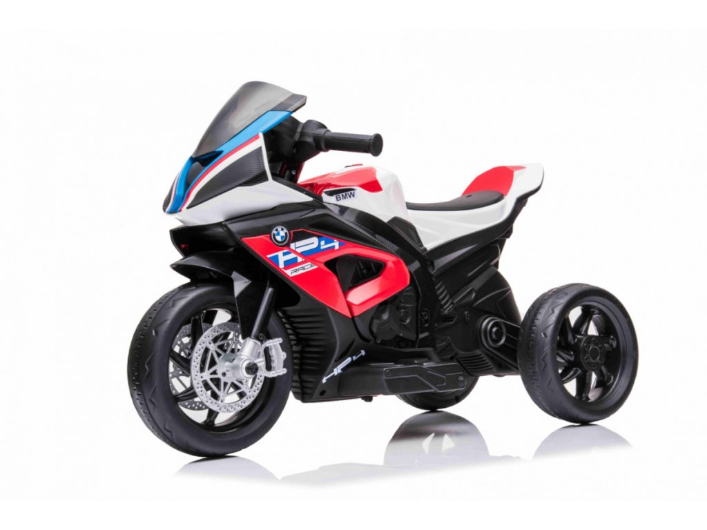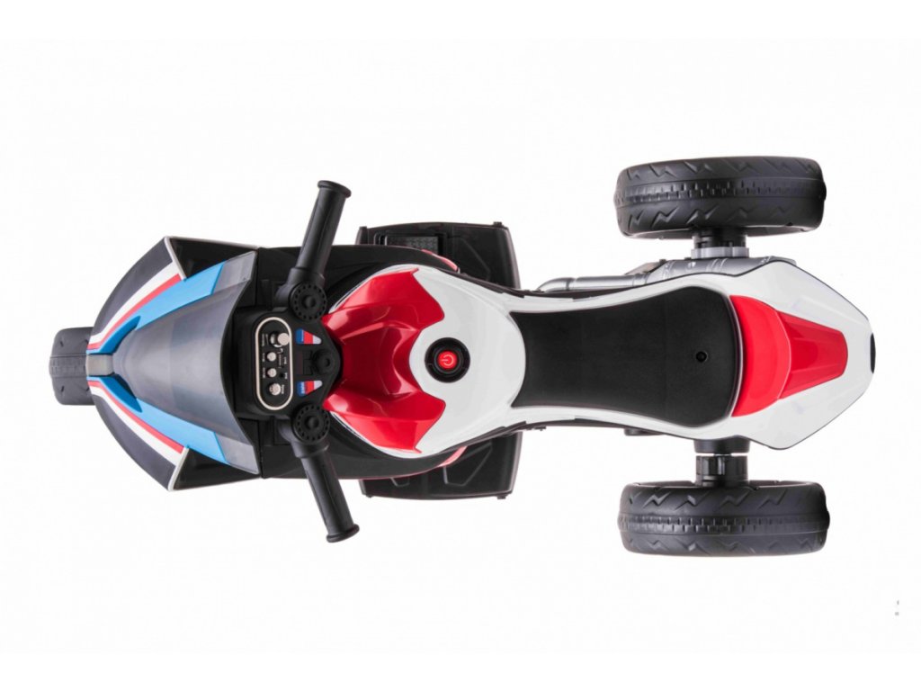 Детски акумулаторен мотор BMW HP4 червен с иновативен дизайн и богато оборудване. Музикален панел с входове за MP3, AUX и USB. Седалката е изработена от мека еко кожа.