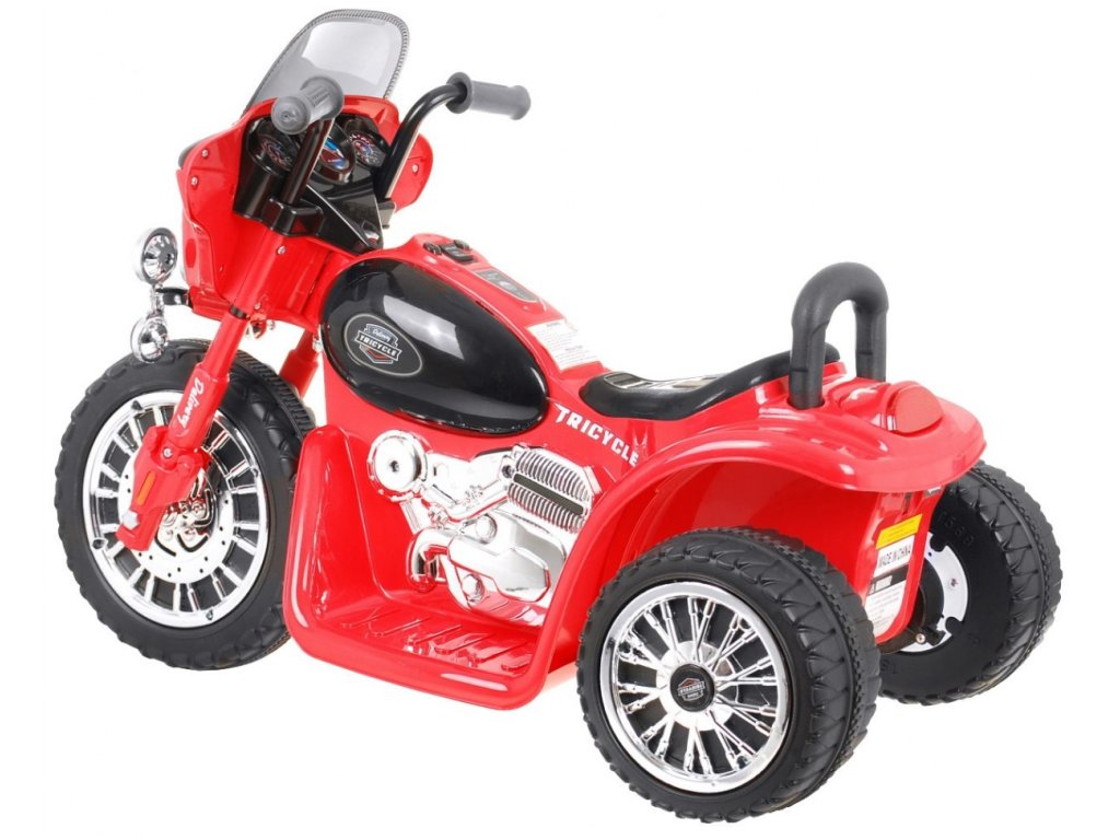 Детски акумулаторен мотор червен, изработен от здрав и висококачествен пластмасов материал, с прецизна изработка. Този детски електрически мотор може да се движи в две посоки – напред и назад. Управлява се чрез превключвател на резервоара и с педал на платформата за крака. Моторът спира автоматично, когато детето свали крака си от педала. Моторът има светещи фарове и звукови ефекти като клаксони, звук на двигател и стартиране. С този детски мотор децата ще се забавляват, играейки на полицаи.