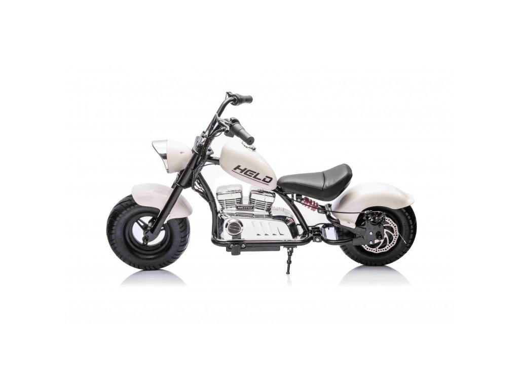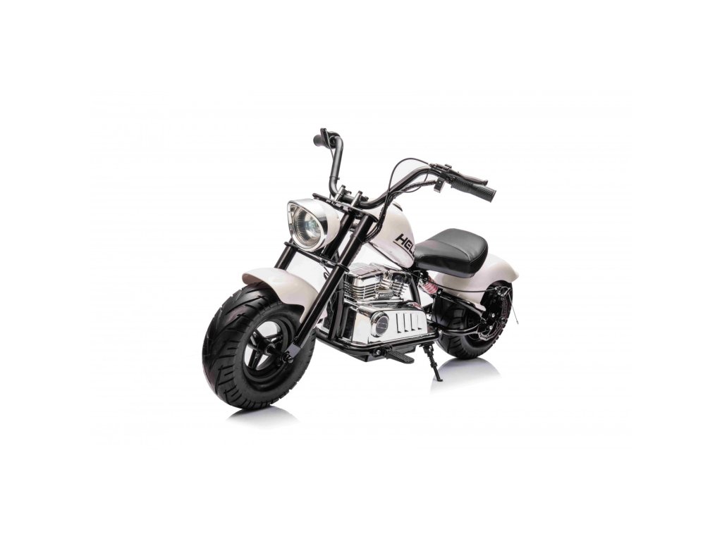Детски акумулаторен мотор Chopper Warrior 36V бял разполага с мощен електрически двигател и батерии. Карайки този детски мотор, детето развива своите шофьорски умения и чувство за баланс. Моторът се движи само напред и е оборудван с удобно седалка, покрита с еко кожа, която осигурява комфорт по време на каране. Детският мотор има също така вградени светлинни ефекти и стилен дизайн, който няма да остане незабелязан от околните.