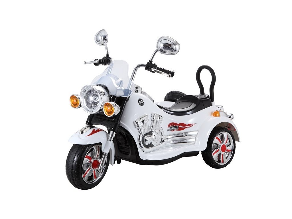 Детски акумулаторен мотор Чопър с кош отстрани бял с мощен мотор 2x45W. Детето може да се движи с променлива скорост от 3 до 5 км/ч, а в коша, който е прикрепен към мотора, може да превозва пътник до 10 кг. Моторът е оборудван с аудио панел, който възпроизвежда MP3 музика. Детето може да използва и предни LED светлини за осветяване по време на движение.