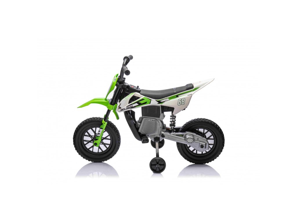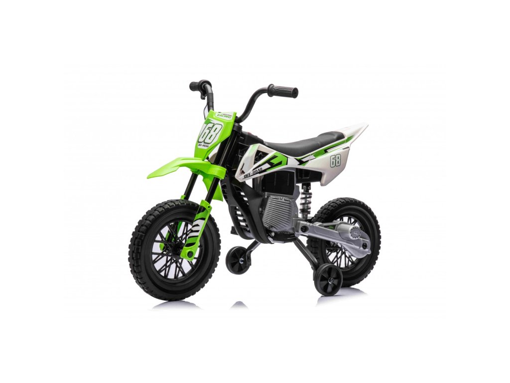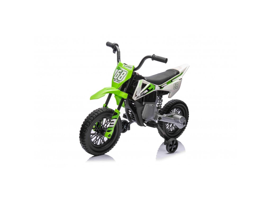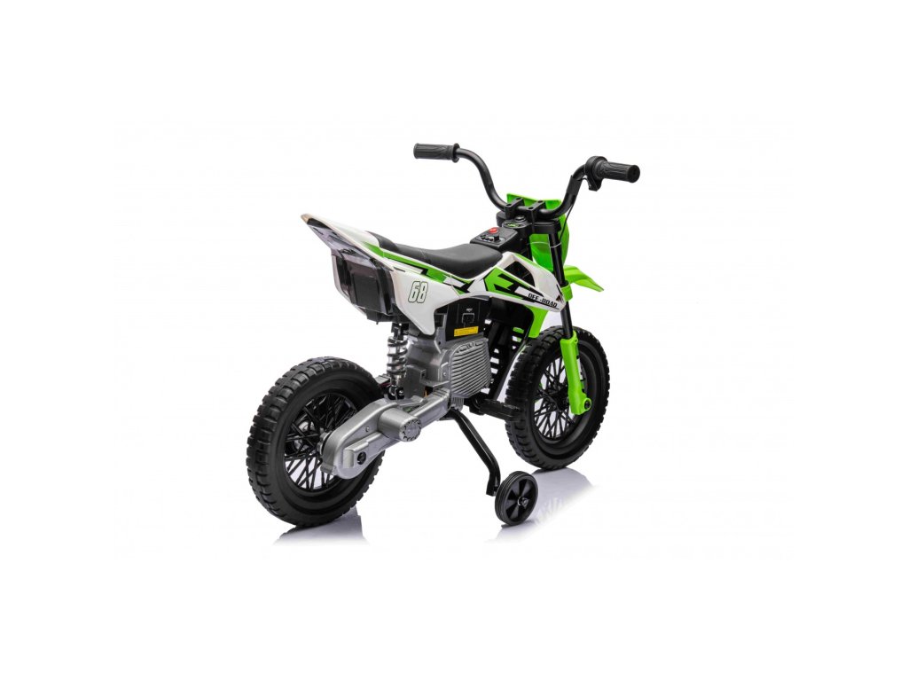 Детски акумулаторен мотор Cross Pantone 361C зелен разполага с два мотора с мощност 30W и акумулатор с капацитет 12V 4,5Ah. Моторът е оборудван с леки EVA пяни колела, които се адаптират към различни повърхности. За по-малките водачи моторът разполага с странични помощни колела, които могат лесно да се свалят, когато детето порасне.