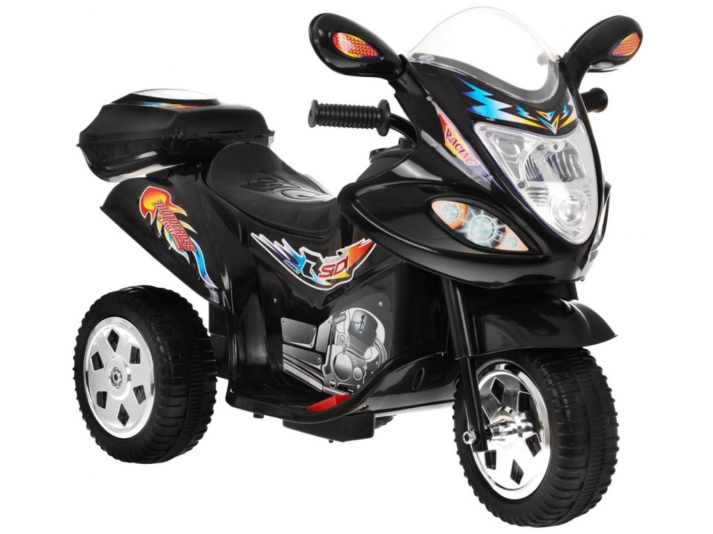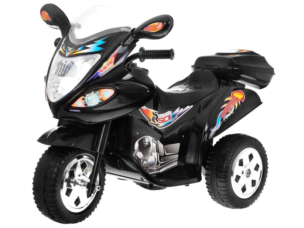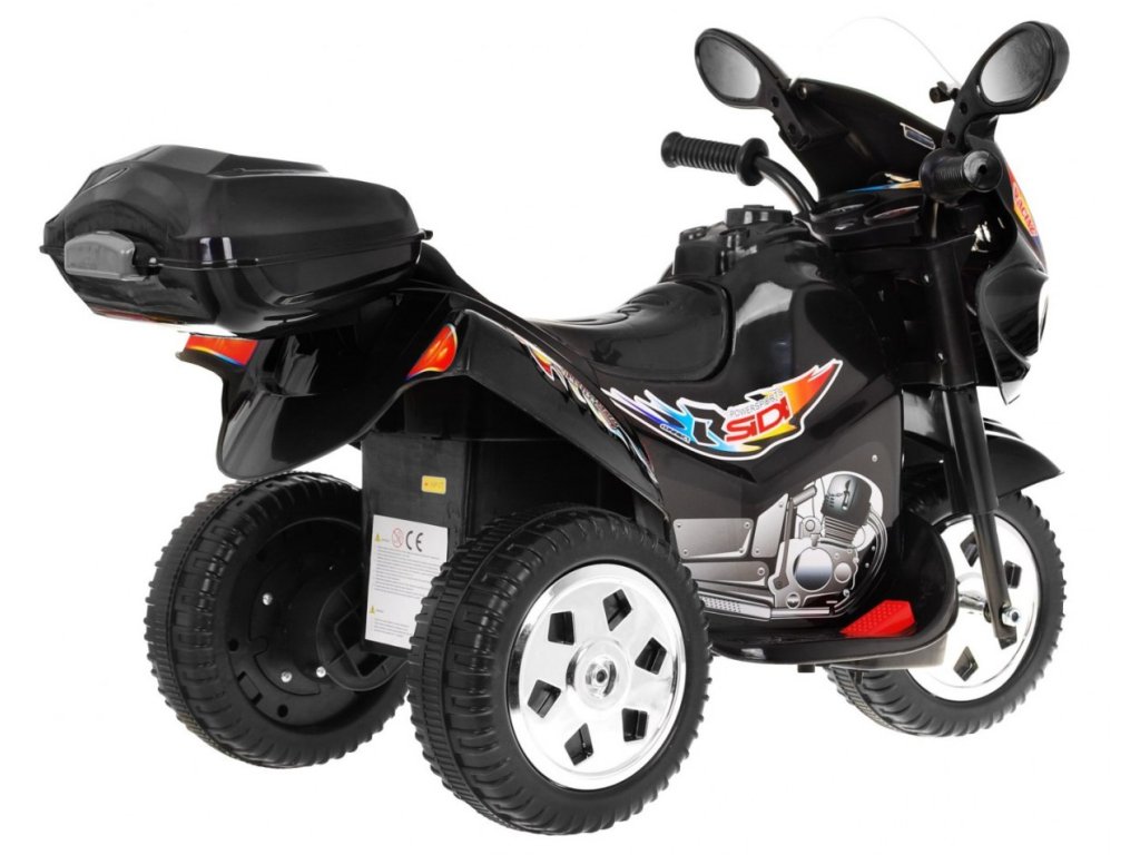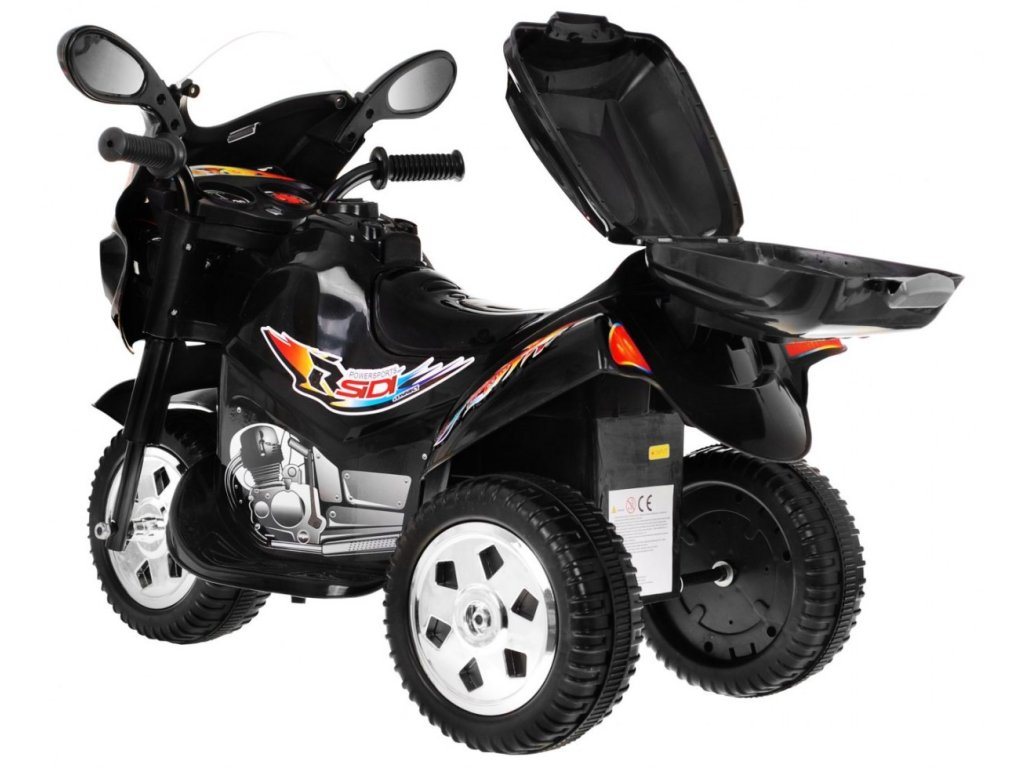 Детски акумулаторен мотор скутер черен 1188 с мощен пластмасов корпус, изработени от висококачествени материали с прецизна изработка. Управлява се лесно – напред/назад с помощта на бутон върху резервоара и педал с крак на подложката. При неизползване на педала, моторът задейства спирачката. Моторът разполага със светлини и звукови ефекти за по-реалистично изживяване. Уникалният мотор има отварящ се куфар, хромиран вътрешен обръч на колелото и декоративен капак на двигателя.