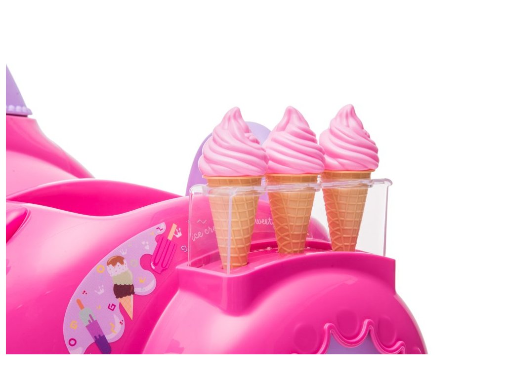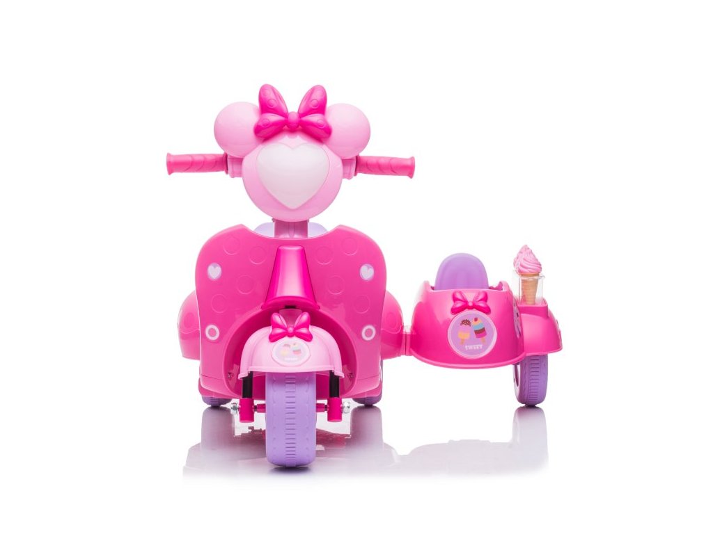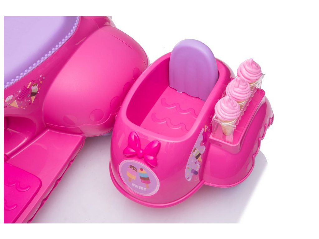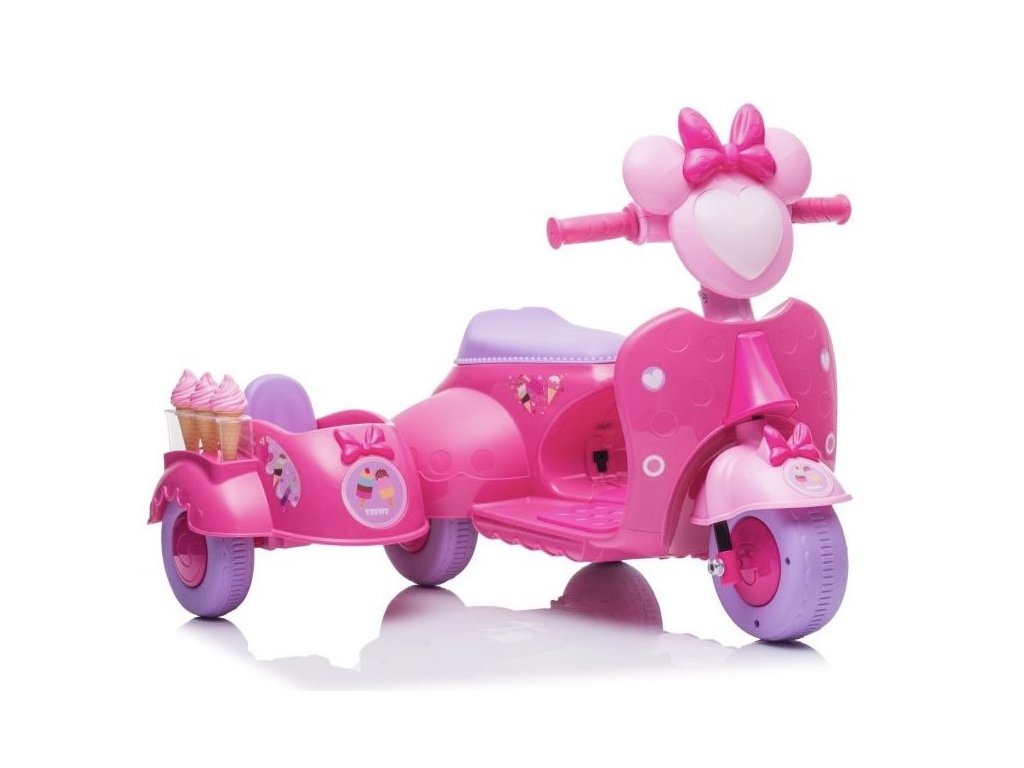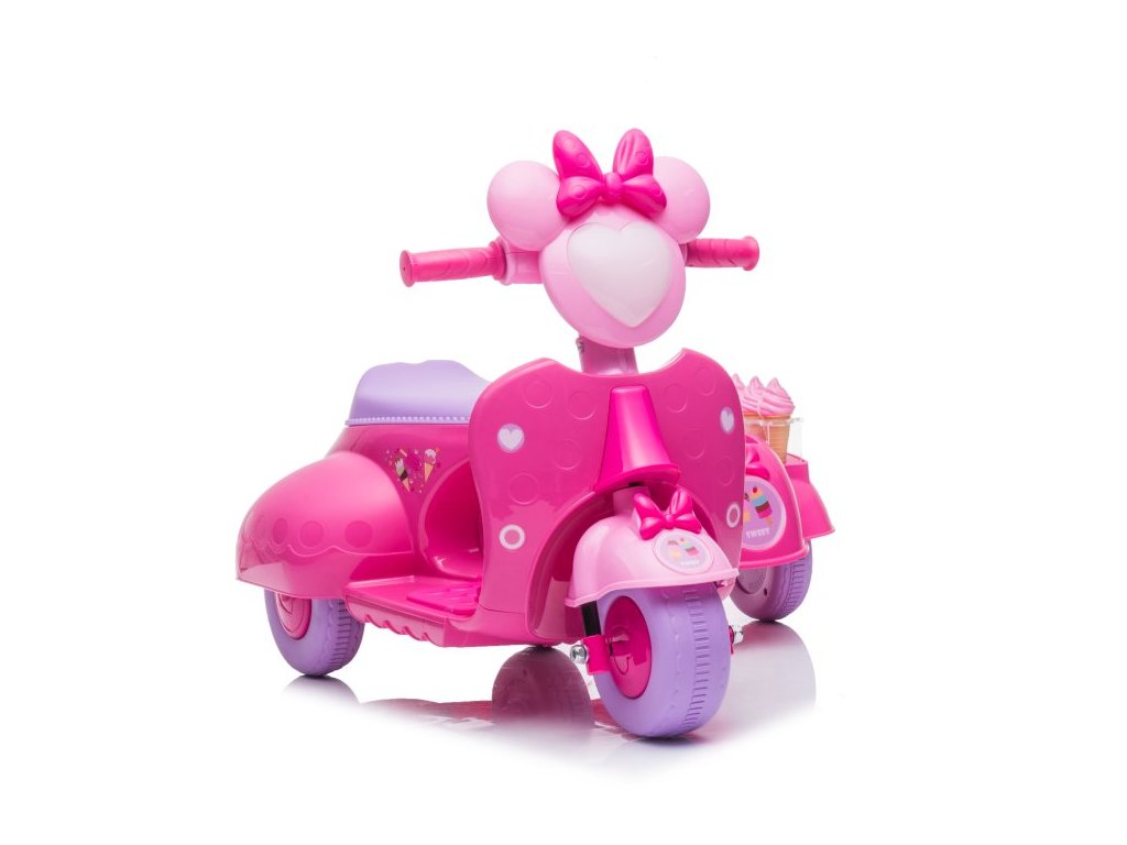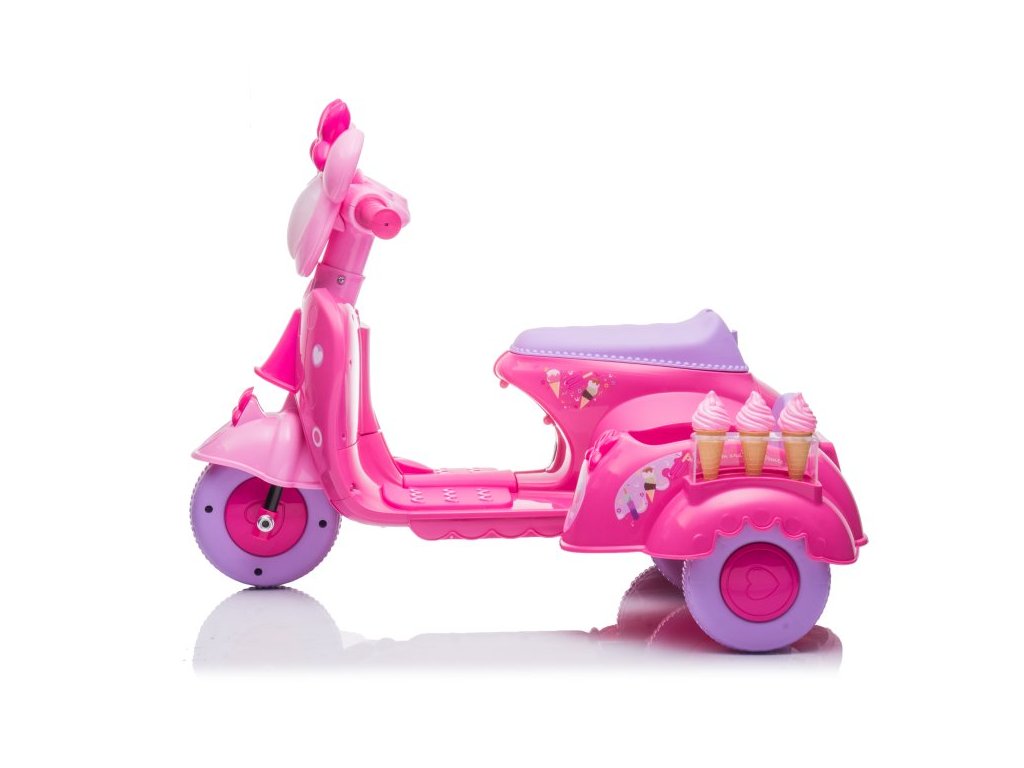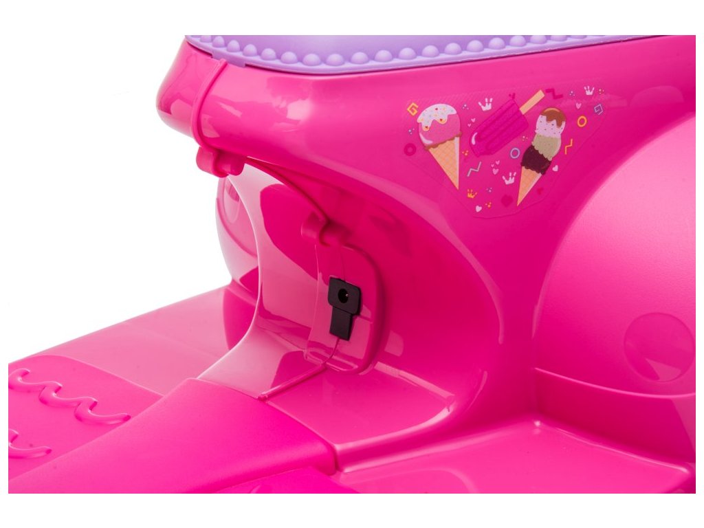 Детски акумулаторен мотор скутер сладолед розов е идеален избор за малки мотористки, които ценят стил и интересен дизайн. Моторът работи с електрически мотор с мощност 35W и акумулаторна батерия 6V 4Ah. Максималното натоварване на скутера е 30 кг. Сред оборудването му са предварително записана музика и светлини с предни LED лампи.