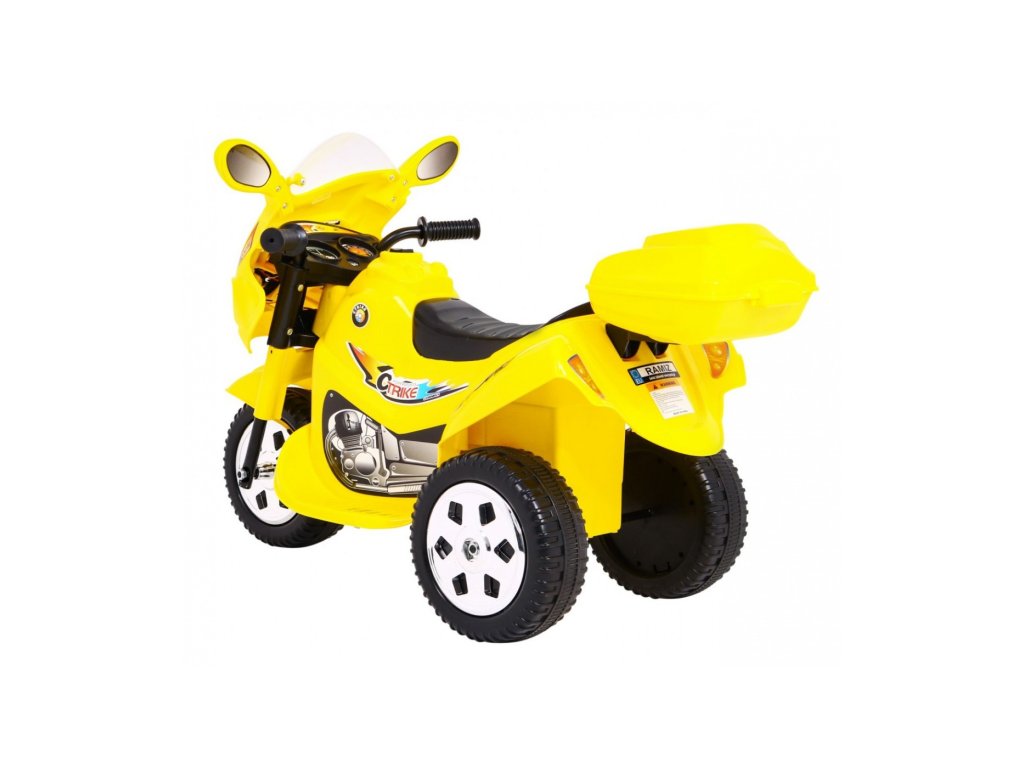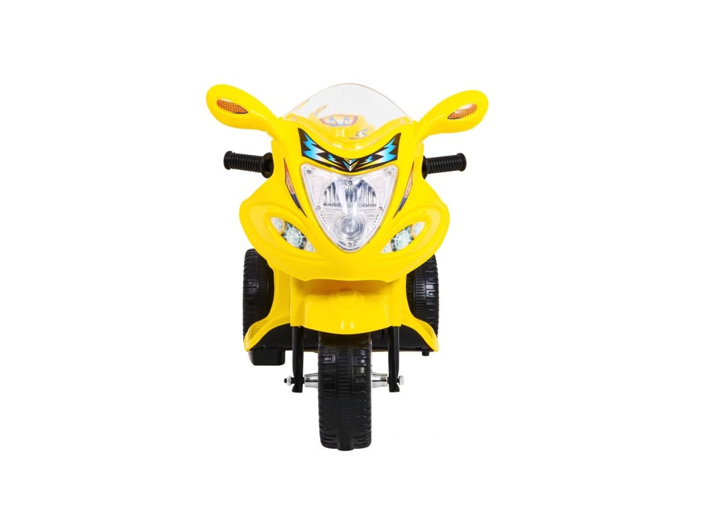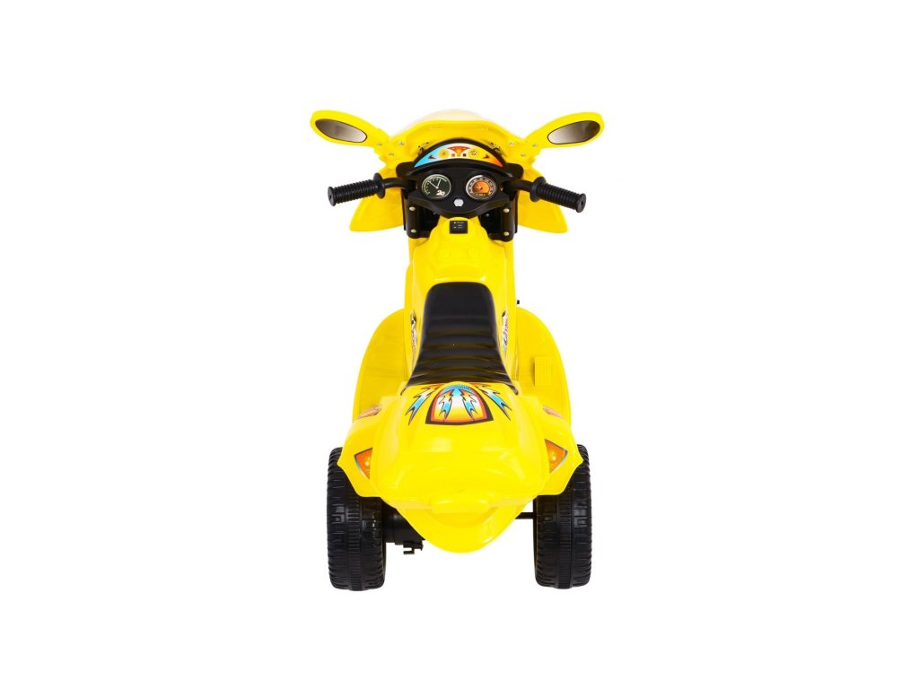 Детски акумулаторен мотор скутер жълт, изработен от здрави пластмаси, с качествени материали и прецизна изработка. Моторът се управлява лесно с превключвател на резервоара и крачен педал на поставката, позволяващ движение напред и назад. Когато педалът не е натиснат, двигателят работи като спирачка. Моторът е със светлини и звукови ефекти за по-реалистично изживяване. Уникалният дизайн включва отваряем багажник, хромирано вътрешно колело и декоративен двигател.