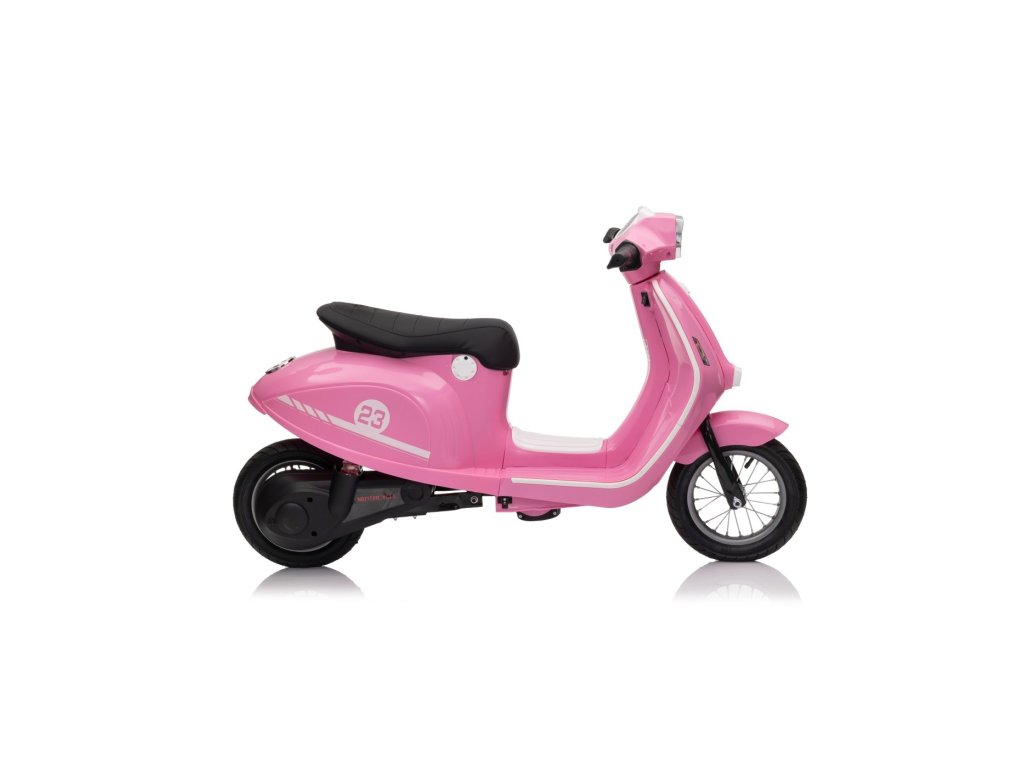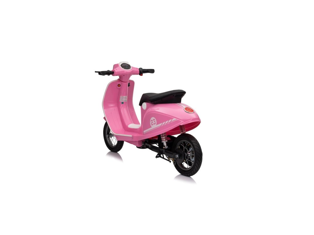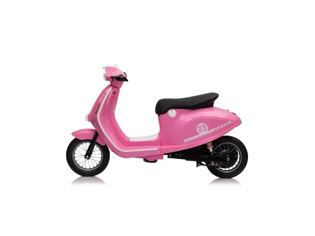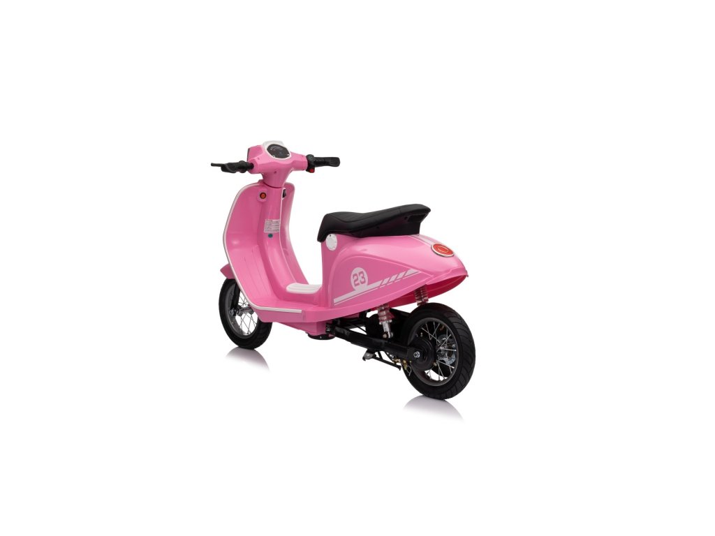 Стилен детски акумулаторен скутер Ретро 23 розов предлага уникално усещане при каране с характерния си ретро дизайн и съвременни технологии. Скутерът е оборудван с мощен 350W мотор, надуваеми гуми и окачване, което осигурява комфортно и безопасно пътуване.