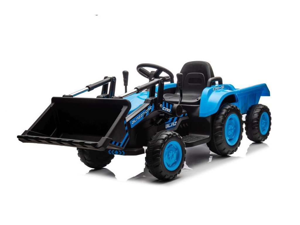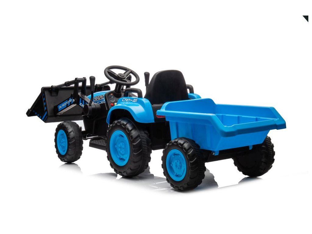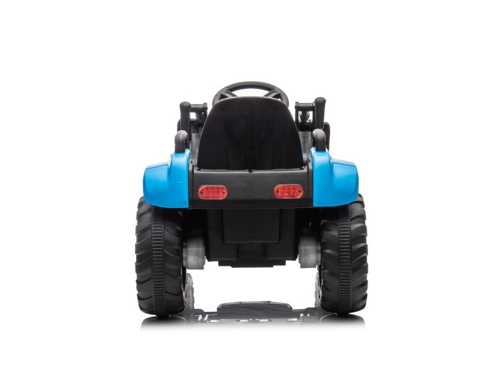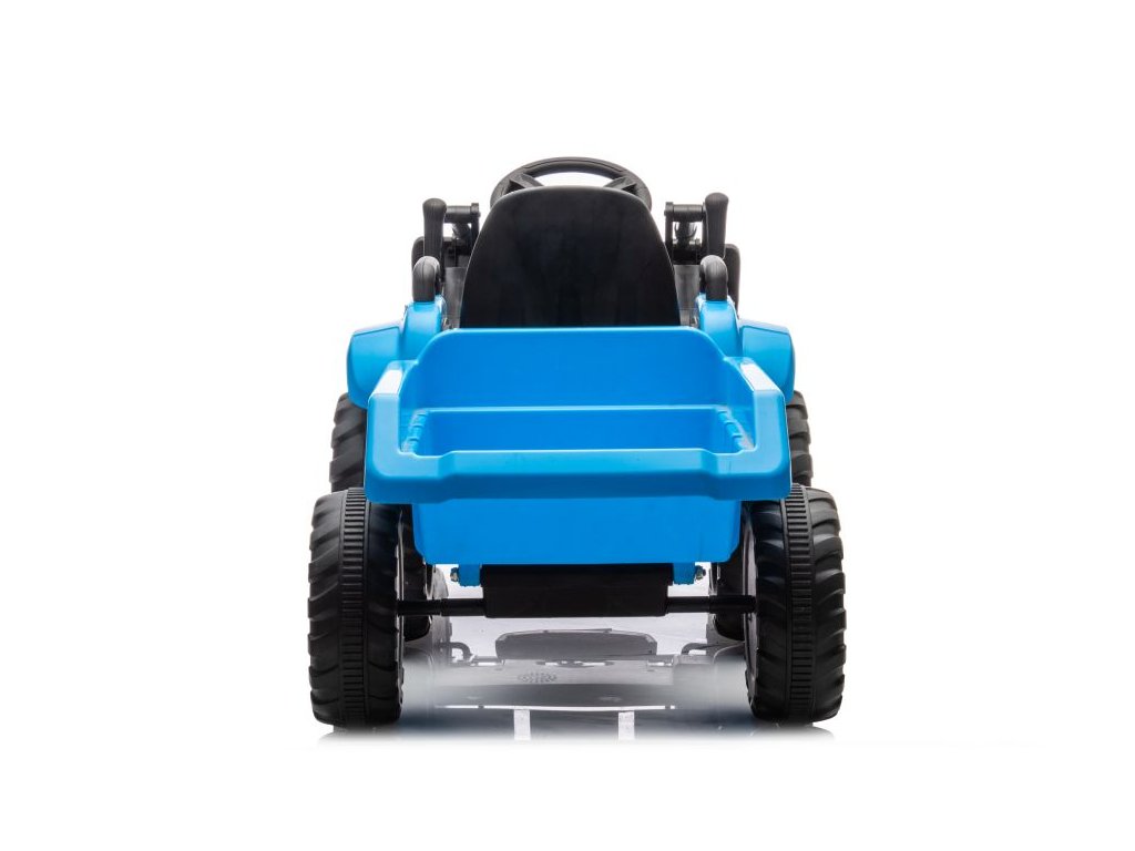 Детски акумулаторен трактор със самосвал и плуг, син се адаптира не само на твърда настилка благодарение на здравата си конструкция и големи гуми. Тракторът е оборудван с два мотора с обща мощност 90W. Управлението е изключително лесно – просто натиснете педала за газ и тръгнете навън. При отпускане на педала тракторът автоматично спира. Пътуването става още по-приятно с музика, която може да пускате сами чрез входовете за MP3 и USB.