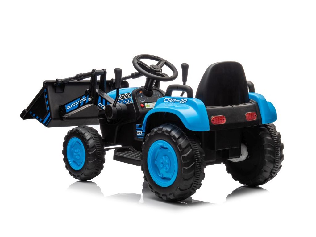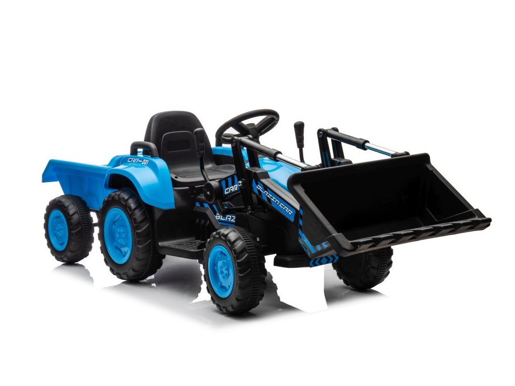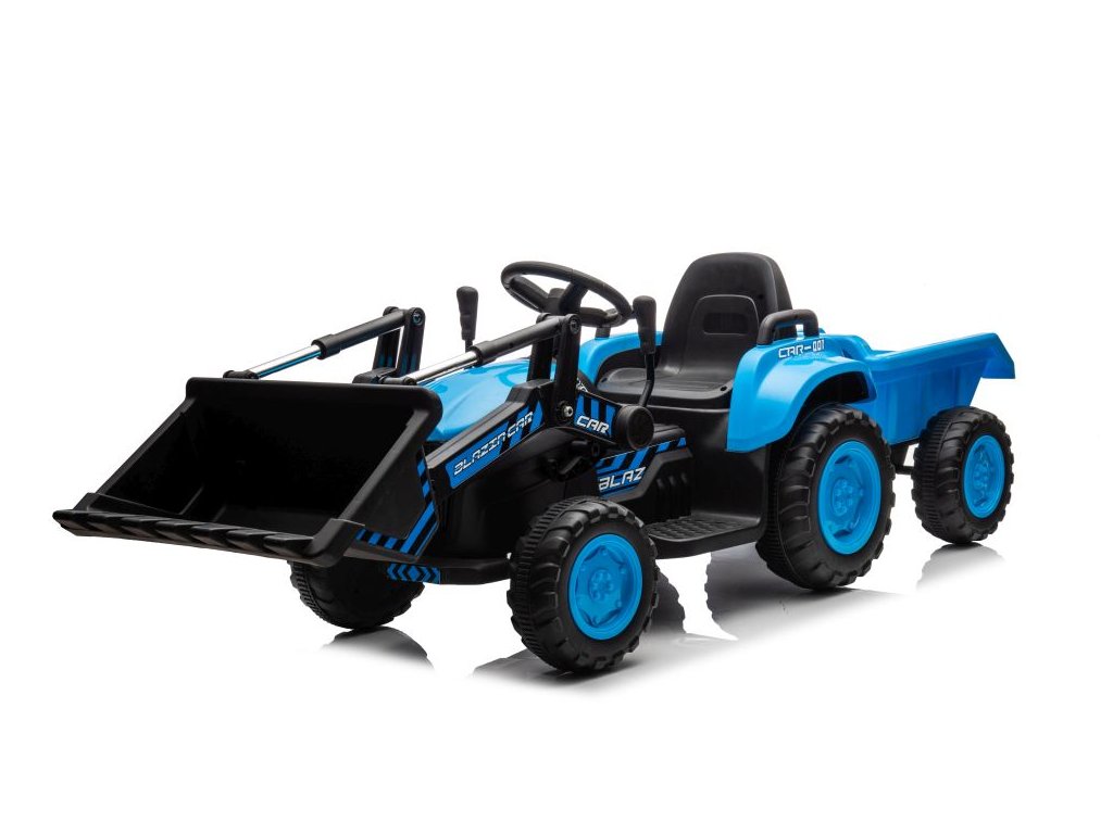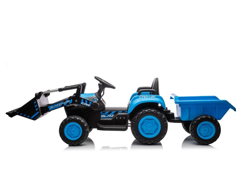Детски акумулаторен трактор със самосвал и плуг, син се адаптира не само на твърда настилка благодарение на здравата си конструкция и големи гуми. Тракторът е оборудван с два мотора с обща мощност 90W. Управлението е изключително лесно – просто натиснете педала за газ и тръгнете навън. При отпускане на педала тракторът автоматично спира. Пътуването става още по-приятно с музика, която може да пускате сами чрез входовете за MP3 и USB.