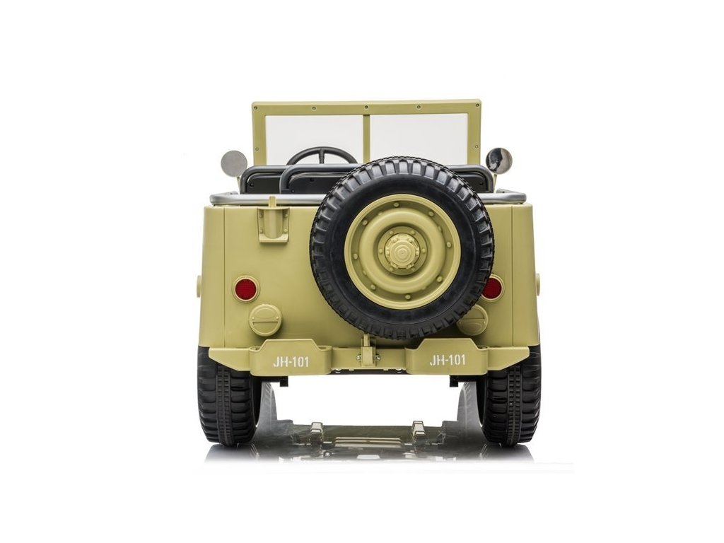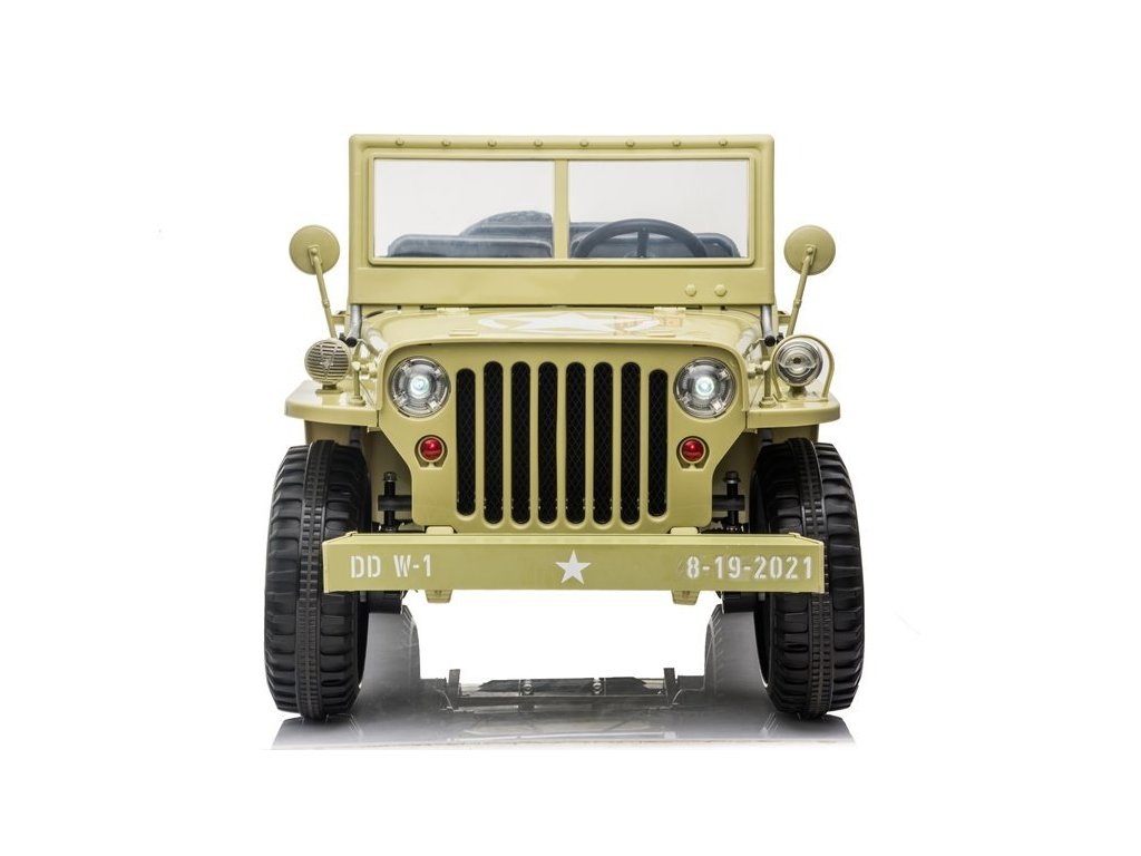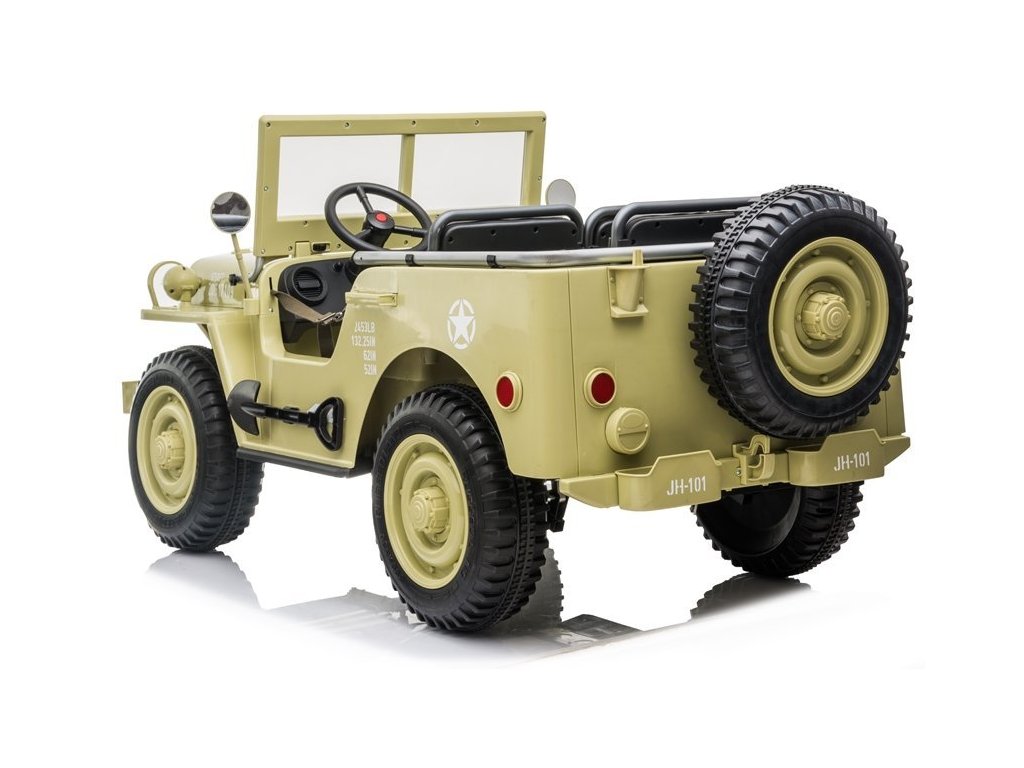 Детски акумулаторен военен Джийп Willys 4x4 триместен бежов се адаптира към различни повърхности благодарение на гумените EVA колела. С четирите задвижвани колела детето може да се впусне в офроуд приключения. Военният джип издържа до 60 кг, което позволява на детето да вози приятел или братче/сестриче. Пътуването става по-забавно с аудио и светлинни ефекти. На музикалния панел има USB и SD вход, както и възможност за свързване на MP3 плейър или Bluetooth.