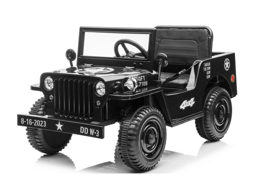 Детски акумулаторен военен джип Willys 4x4 черен е оборудван с четири електрически мотора с мощност 35 W и акумулаторна батерия 12V 7Ah. За комфортно каране допринасят пеномерните гуми от тип EVA. Детето ще се забавлява още повече с музикалния панел, който включва MP3, предварително записани мелодии, възможност за свързване чрез Bluetooth и USB вход. На волана има клаксон.