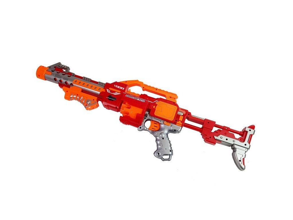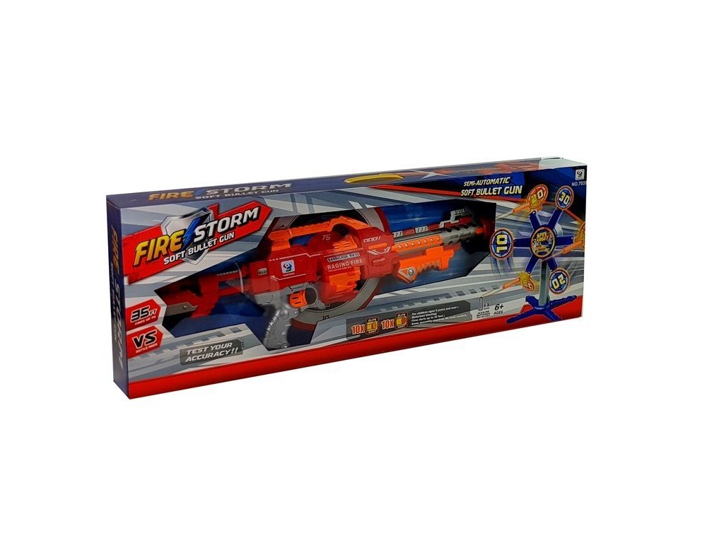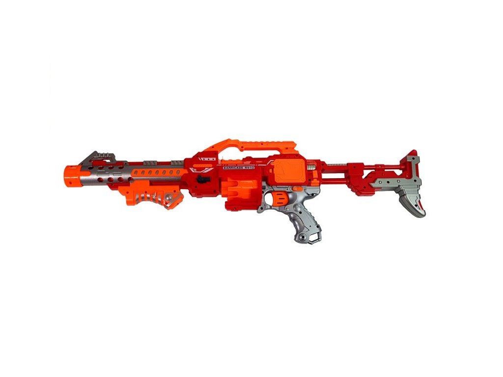 Детският автомат за меки пълнители с въртяща се мишена е изработен от сертифициран пластмасов материал. Неговата конструкция наподобява истинско оръжие, но е изключително безопасен – няма остри върхове или опасни елементи. За да активирате автомата, е необходимо да поставите подходящи батерии (3 x „AA“, не са включени в комплекта), да заредите пълнителя и играчката е готова за употреба. Забавлението може да започне!
