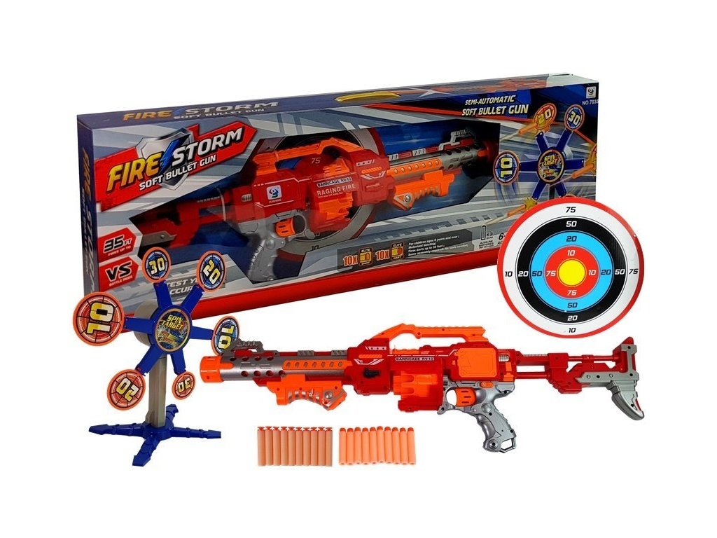 Играчките, имитиращи оръжия, са елементи, които често присъстват в момчешките игри. Представеният Детски автомат за меки пълнители с въртяща се мишена със сигурност ще забавлява малките момчета за дълги часове и също така ще им позволи да организират много интересни игри, базирани на тяхното въображение.