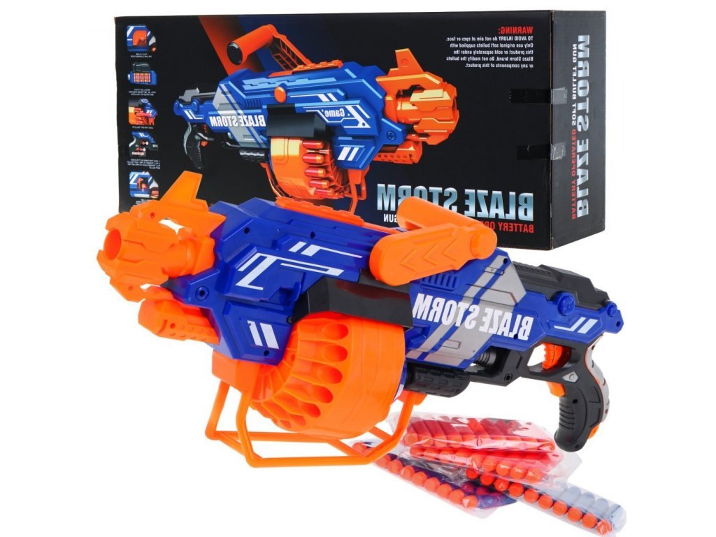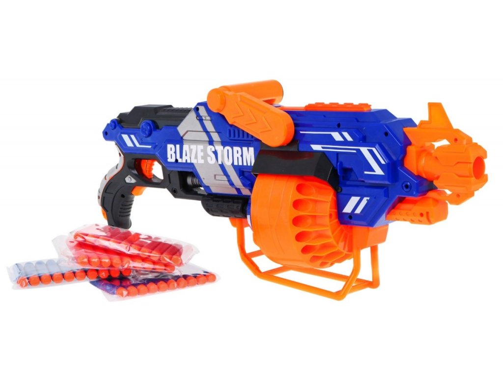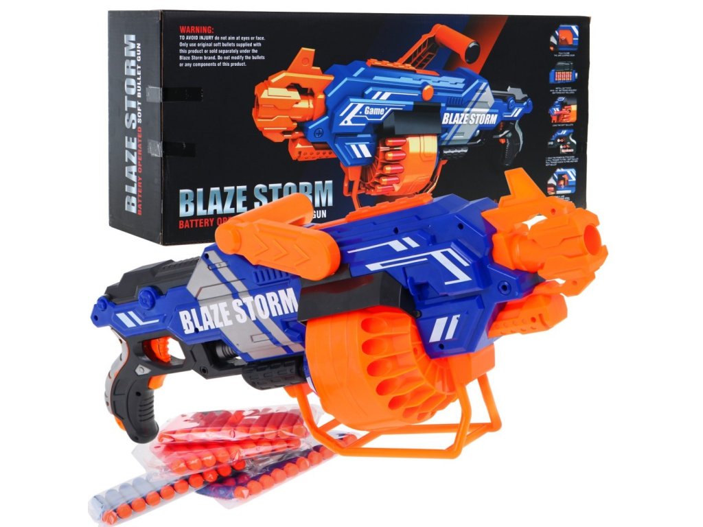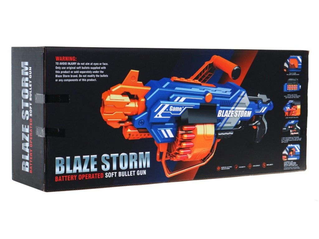 Детски автоматичен пистолет Blaze Storm картечница е пълноавтоматично оръжие за пяна с меки патрони. Пистолетът е лесен за употреба и осигурява дълъг и точен обхват на стрелба. За да започнете, първо трябва да поставите батериите, да напълните пълнителя, да насочите и да натиснете спусъка. Пълнителят побира до 20 меки патрона. В комплекта са включени 20 сини и 20 червени патрона.