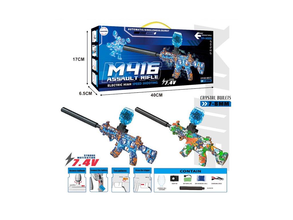 Изживейте екшън забавление с електрическия гел пистолет M416, който стреля с безопасни гел топчета. Благодарение на мощната 7,4V батерия, той има висока скорострелност и позволява стрелба в автоматичен и единичен режим. Реалистичният дизайн, подвижният заглушител и пълнителят за топчета ще гарантират перфектно игрово изживяване за феновете на екшън игрите.