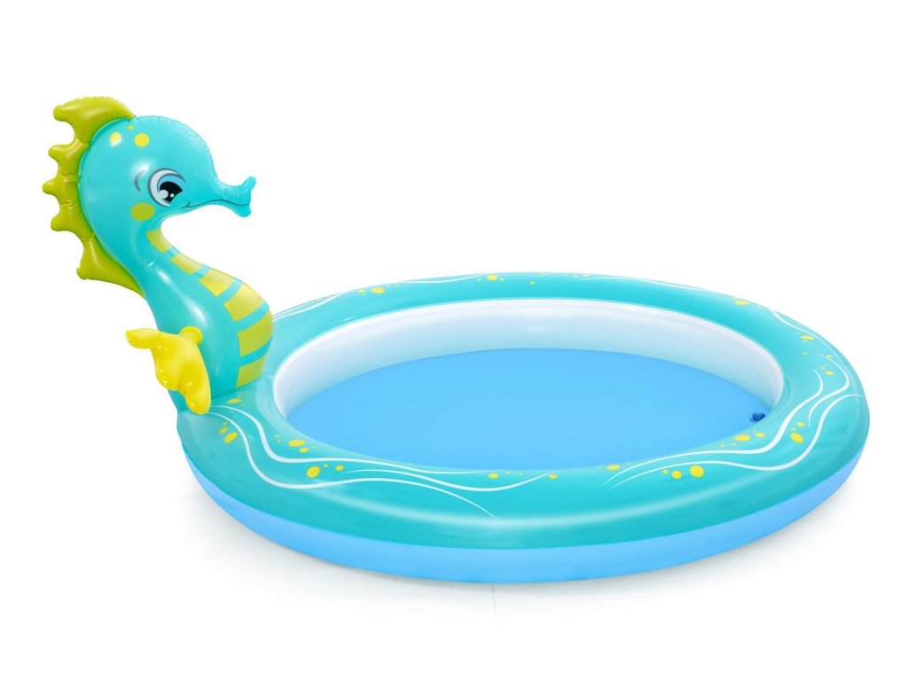 Басейнът е изработен от мек, но издръжлив материал и е максимално безопасен за най-малките деца. Основната атракция е морският кончета, от който при свързване на градински маркуч изтича вода.